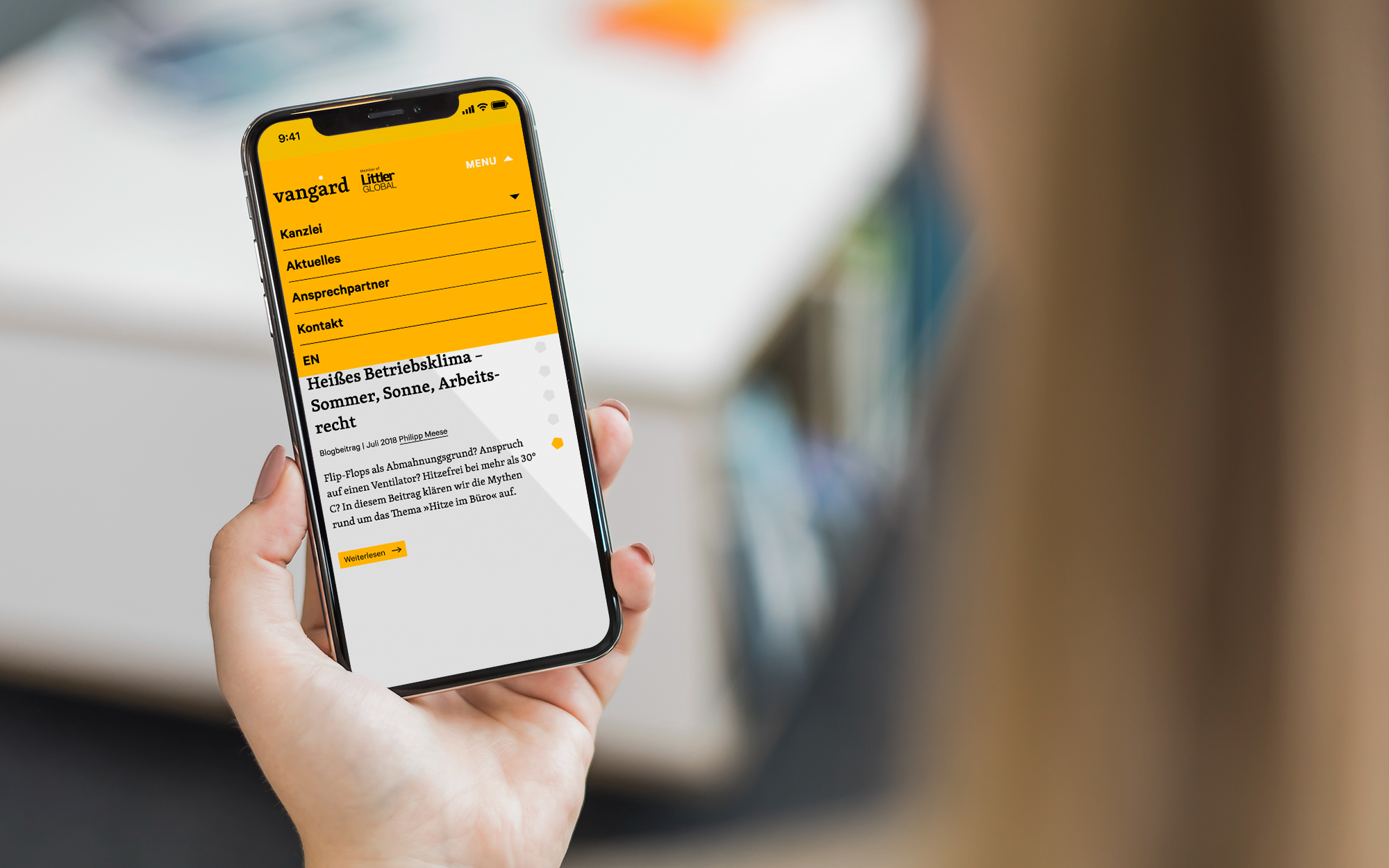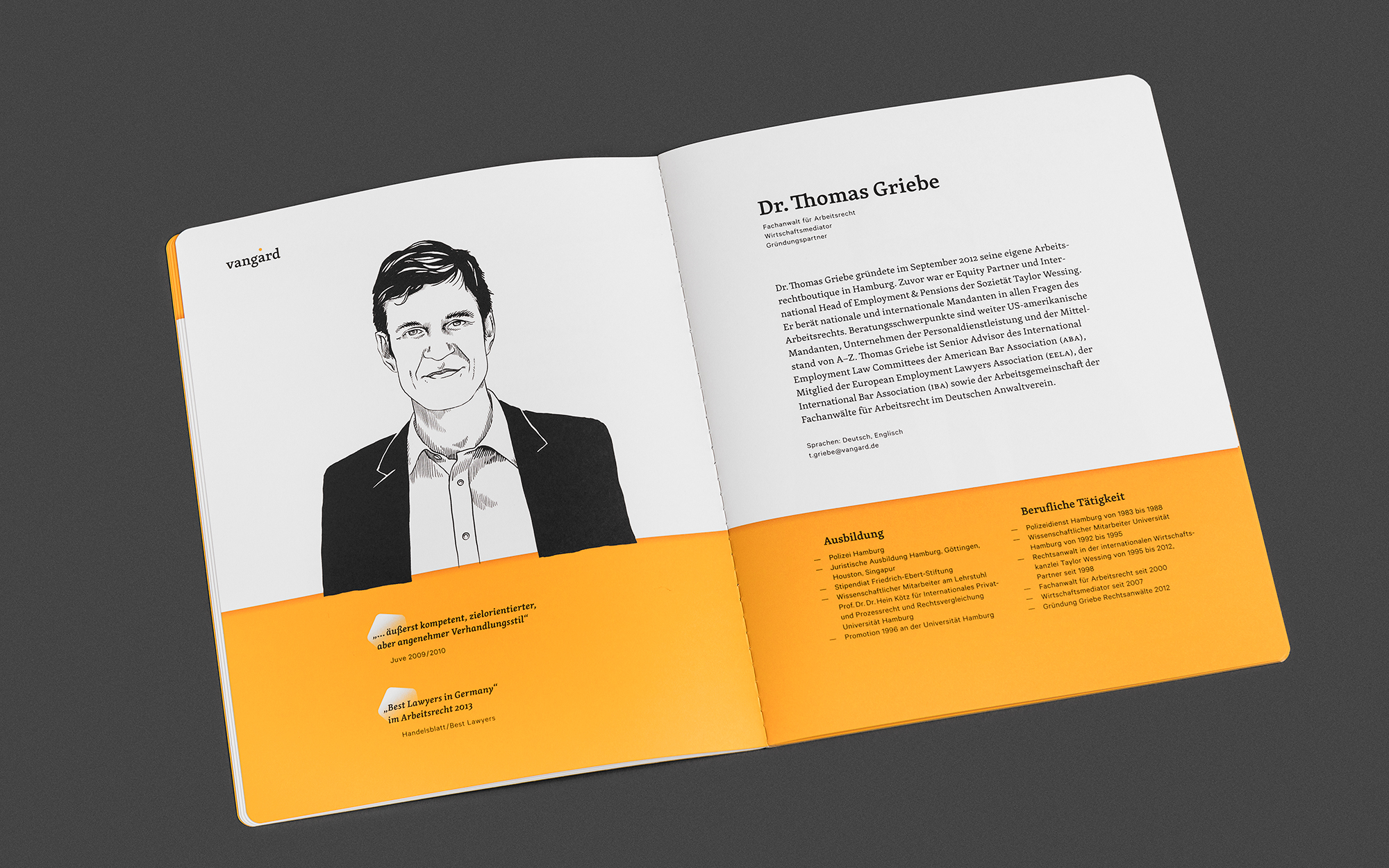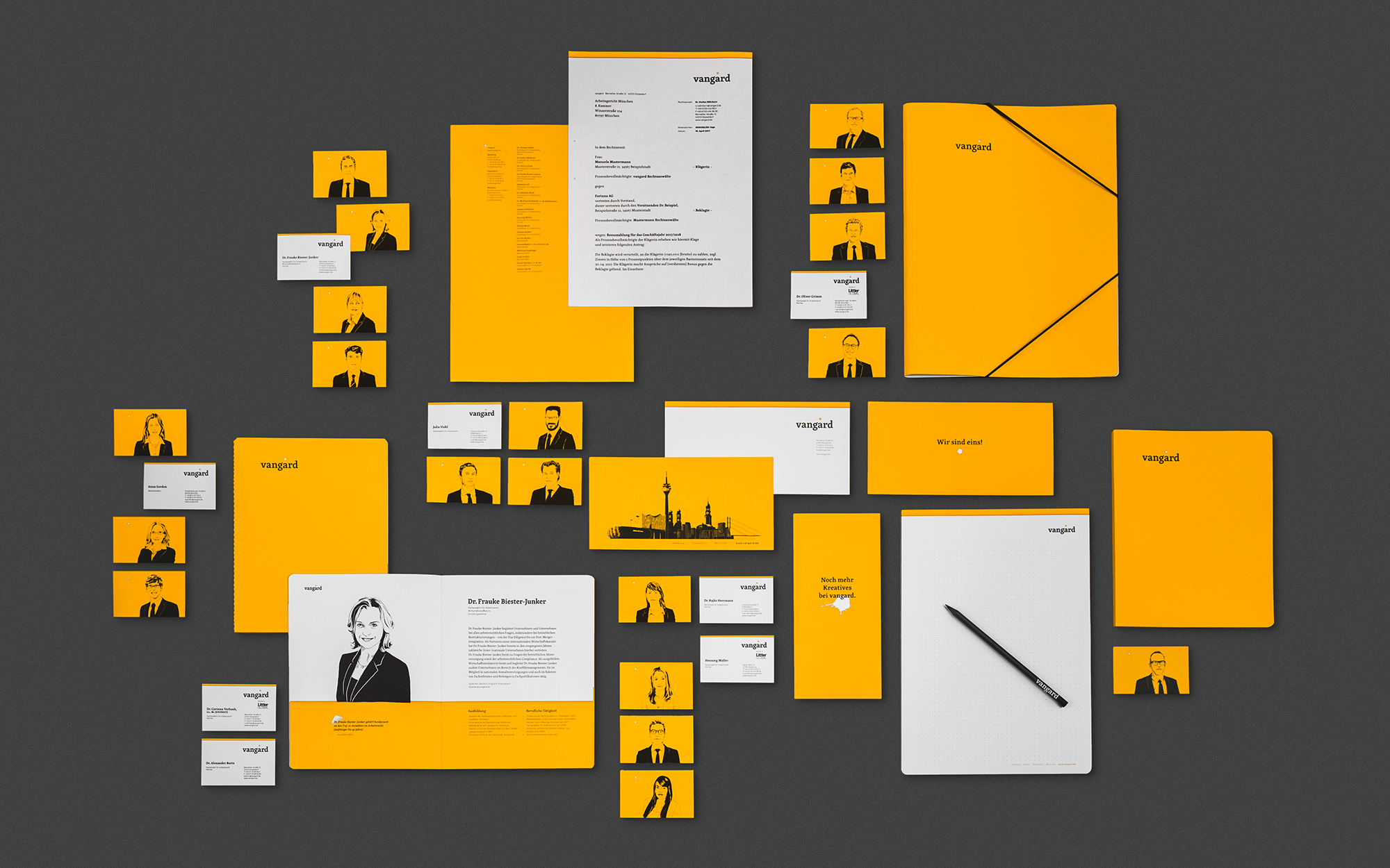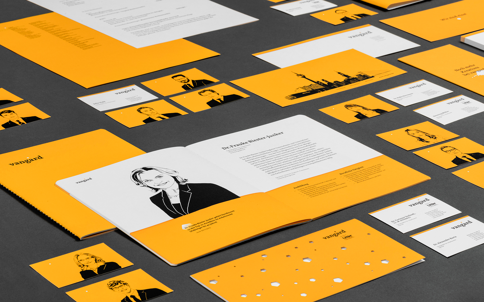 Traditionell vermitteln Anwaltskanzleien in ihren Auftritten meist Werte wie Sachlichkeit, Verlässlichkeit und eine manchmal etwas langweilige Bodenständigkeit. Für eine Kanzlei jedoch, die ihren Namen vom französischen »avant-garde« ableitet und sich Kreativität und Originalität auf die Fahnen geschrieben hat, sind diese Mittel sicherlich nicht gefragt. vangard heißt der frisch gegründete Zusammenschluss mehrerer Top-Anwälte mit Niederlassungen in Hamburg, Düsseldorf und München. Auf dem Gebiet des Arbeitsrechts will die junge Kanzlei mit der Verbindung von Kompetenz und neuen Denkweisen Akzente setzen. Passend dazu verdeutlicht ein für das Justizwesen ungewöhnliches Corporate Design das Selbstverständnis als progressiver Impulsgeber: Kräftiges Gelb prägt sowohl Printmedien wie Visitenkarten, Broschüren und Briefpapier als auch die brandneue Internetpräsenz. Hochkontrastige, handgezeichnete Porträts unterstreichen den ungezwungenen und partnerschaftlichen Charakter der Kanzlei. Im selben Stil gehaltene Illustrationen verschmelzen die Wahrzeichen der drei Standorte zu einer »Super-Skyline«. Das i-Tüpfelchen bildet der »pentagonale skandinavische Schönheitsfleck« im Logo, der ganz nebenbei die neue Einheit der fünf Gründungspartner repräsentiert.