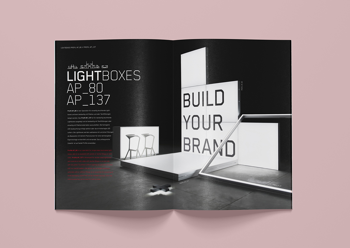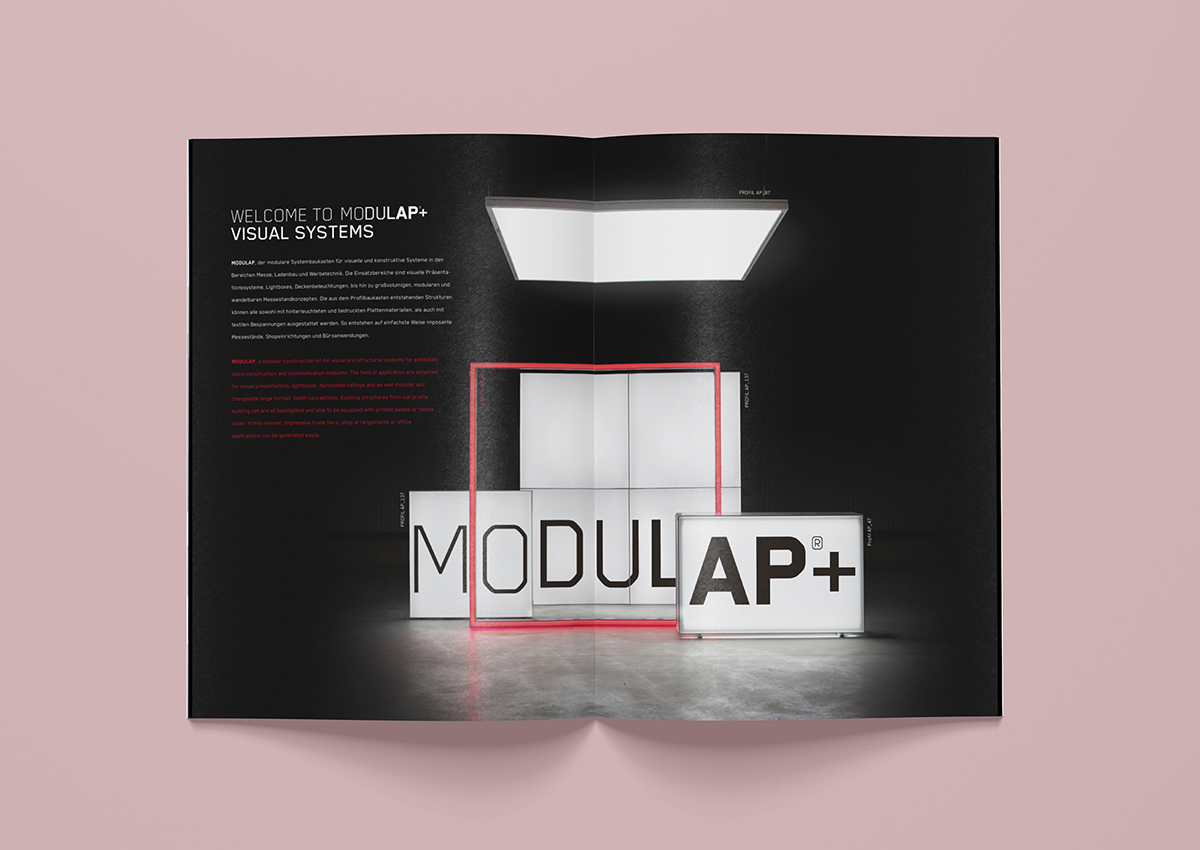 MODULAP, ist ein modularer Systembaukasten für visuelle und konstruktive Systeme in den Bereichen Messe, Ladenbau und Werbetechnik. Die Einsatzbereiche sind visuelle Präsentationssysteme, Lightboxes, Deckenbeleuchtungen, bis hin zu großvolumigen, modularen und wandelbaren Messestandkonzepten. Die aus dem Profilbaukasten entstehenden Strukturen können alle sowohl mit hinterleuchteten und bedruckten Plattenmaterialien, als auch mit textilen Bespannungen ausgestattet werden. So entstehen auf einfachste Weise imposante Messestände, Shopeinrichtungen und Büroanwendungen.