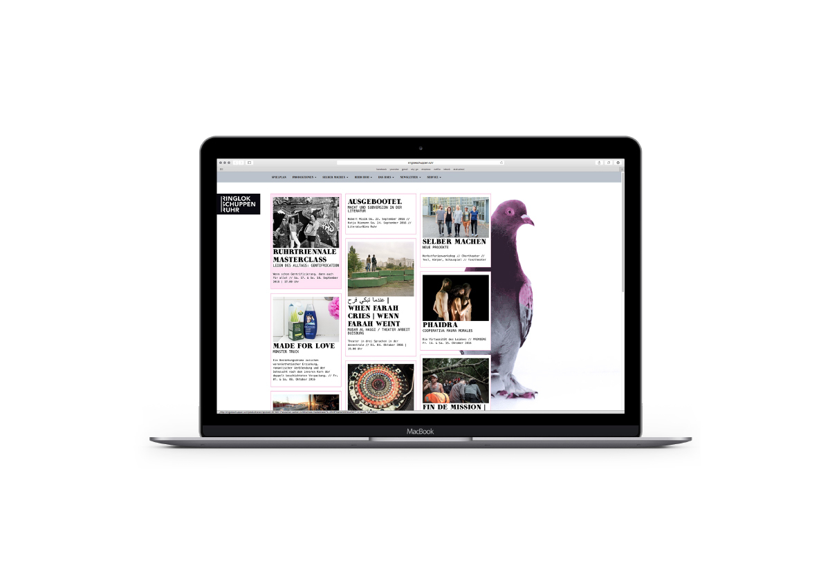 Der Ringlokschuppen in Mülheim an der Ruhr zählt zu den bekanntesten Bühnen des Ruhrgebiets. Mit seinem spartenübergreifenden, internationalen Programm und Aktionen, die oft augenzwinkernd aus der Reihe tanzen, erregt das Haus immer wieder Aufmerksamkeit. Der grafische Rahmen regelmäßiger und besonderer Kommunikationsmittel sowie die Website wird seit 2012 von V2A.NET gestaltet.