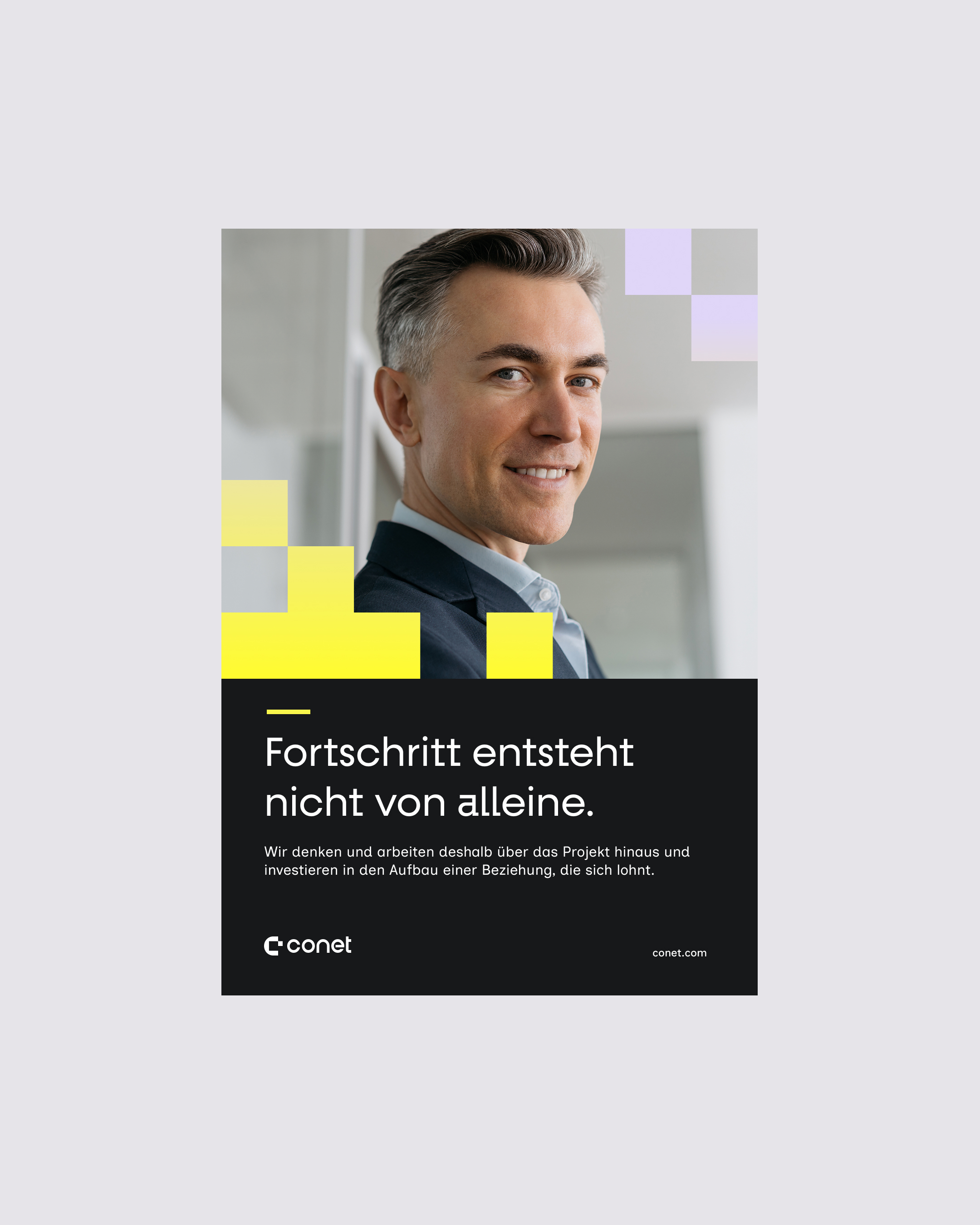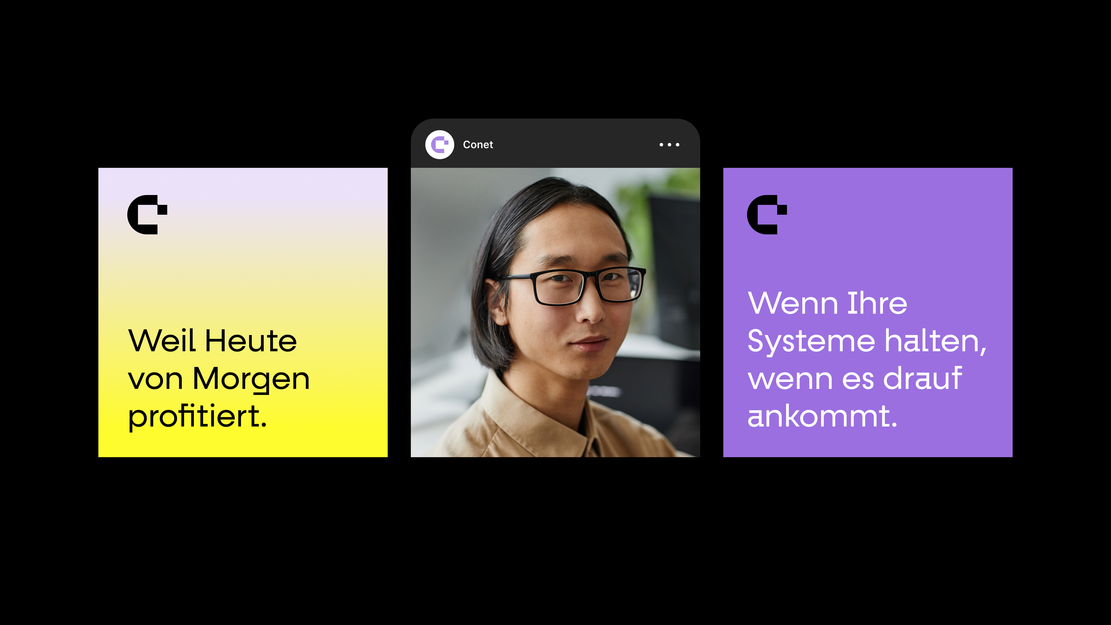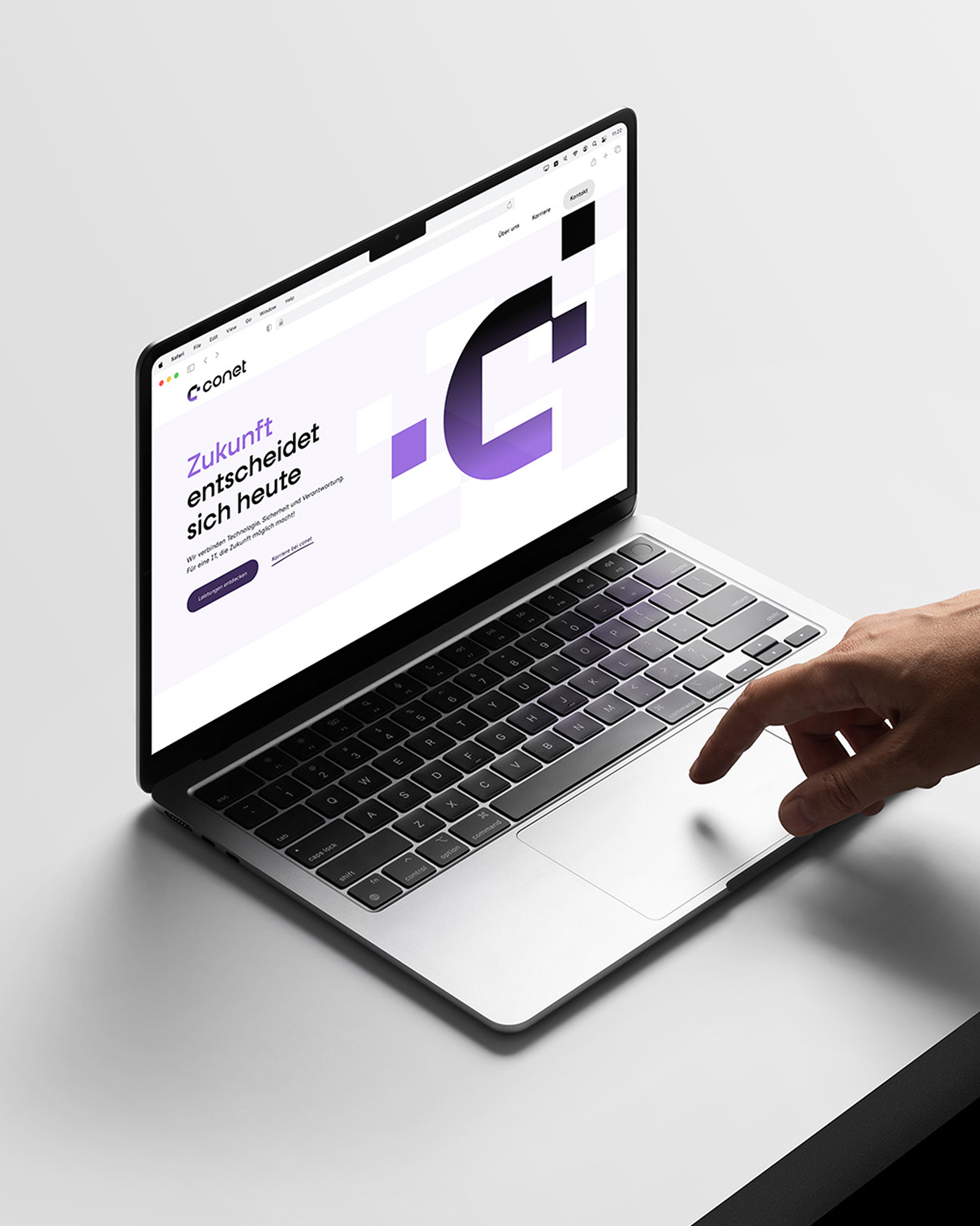 Seit 1987 gestaltet conet als interdisziplinärer Full-Service-IT-Dienstleister digitale End-to-End-Lösungen mit einem Anspruch, der über Technologie hinausgeht. Das Unternehmen mit 17 Standorten richtet sich mit seinen digitalen Lösungen an Ministerien, Verwaltungen, Verteidigung und Unternehmen, bei denen Stabilität entscheidend ist und Ausfall kritische Auswirkungen haben kann. Die Full-Service IT-Unternehmensgruppe übernimmt dafür die Verantwortung und schafft Vertrauen durch Lösungen, die auch morgen noch tragen. Und genau dieses Versprechen sollte mit der Marke vermittelt werden. Heute lösen, was morgen zählt: Während andere Wettbewerber in der Branche nur von Zukunft sprechen, positionierten wir conet hingegen in der Gegenwart. Der Digitalisierungspartner schafft Fortschritt für jetzt und gleichzeitig die Grundlage für morgen. Denn Zukunft entsteht in dem, was heute getan wird, und gestaltet sich nicht durch leere Versprechen von Visionären. Wenn alle nur von Zukunft sprechen und dabei die Gegenwart vergessen, bleibt Zukunft ein Versprechen und das Heute ein Problem. Für dieses Ergebnis führten wir eine Umfrage mit rund 750 Teilnehmenden aus insgesamt 2.000 Mitarbeitenden durch, befragten in Deep Dive Interviews die gesamten Führungskräfte und veranstalteten intensive Markenworkshops mit Teilnehmenden aus verschiedenen Unternehmensbereichen sowie einen Designworkshop. Das Ergebnis war ein realitätsgetreues Abbild für die Neuausrichtung und das zukünftige Erscheinungsbild.