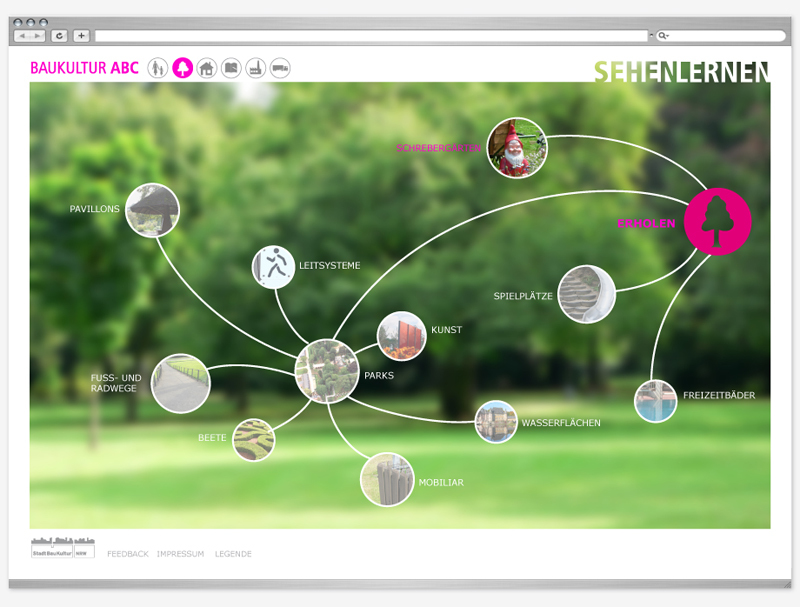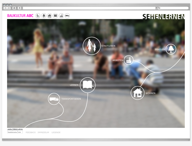 Die Kampagne sensibilisiert die Öffentlichkeit für die gebaute Umwelt und will die Bevölkerung stärker für die Belange der Baukultur gewinnen. SEHEN LERNEN besteht aus drei Bausteinen: dem digitalen BAUKULTUR ABC im Internet, der mobilen SEHSTATION in Städten des Landes Nordrhein-Westfalen sowie Broschüren und Faltblättern für interessierte Bewohner, Kinder und Jugendliche.