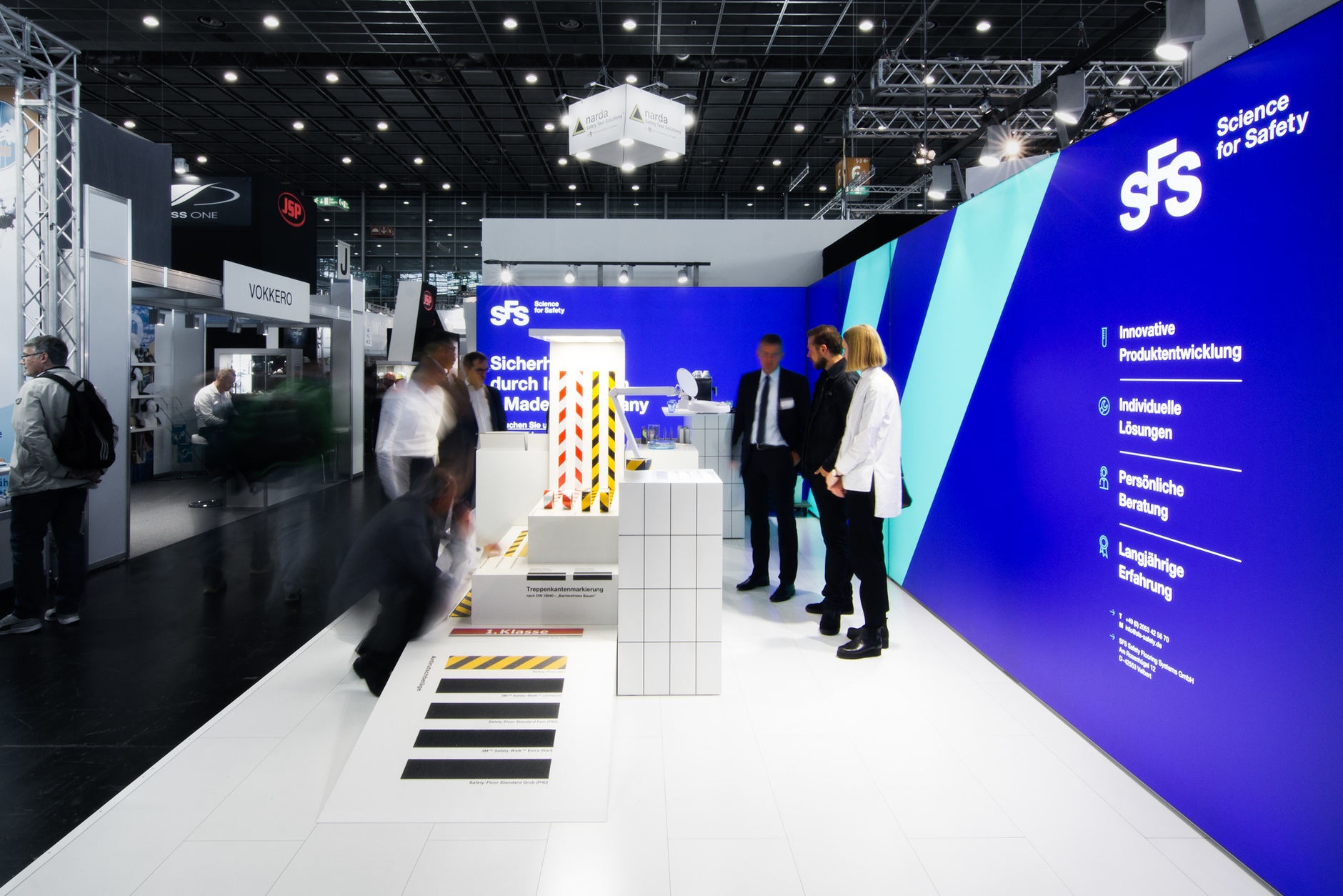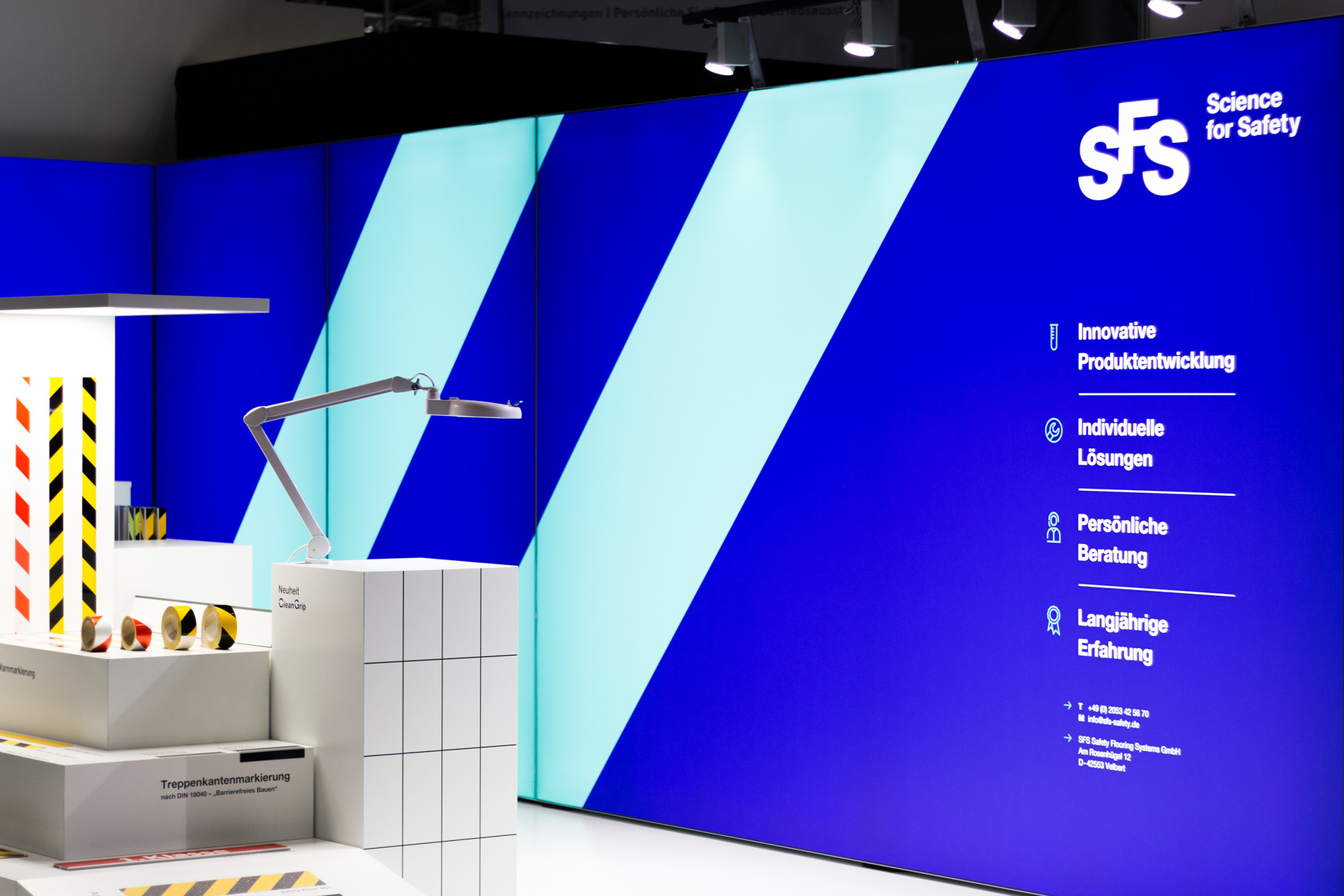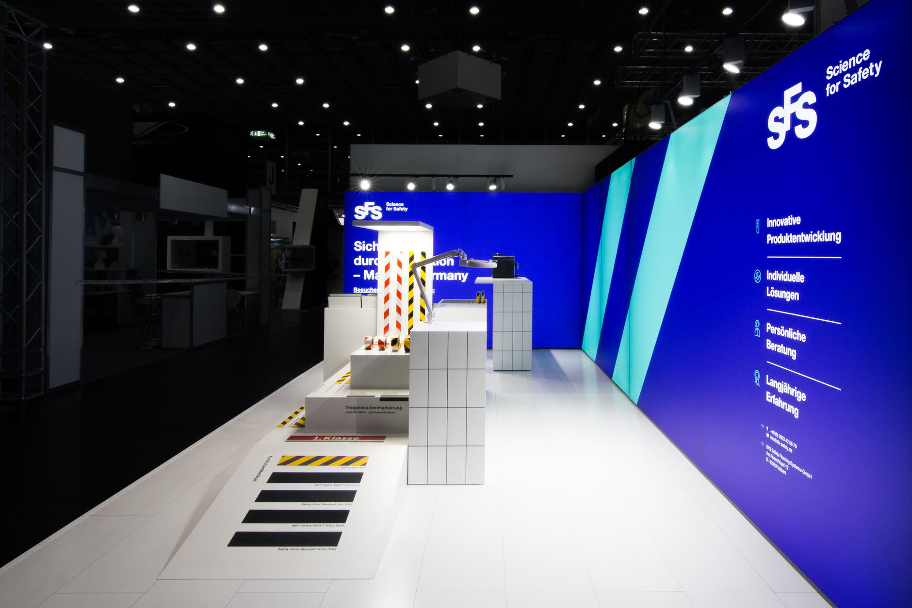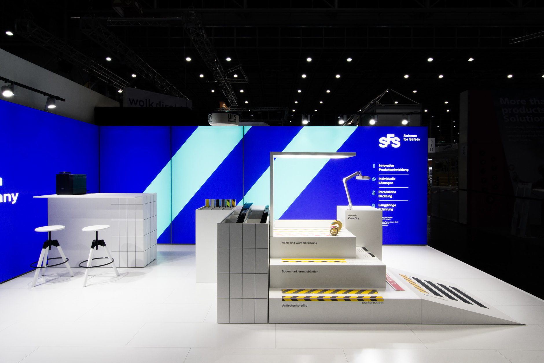 Modularer Messestand für die Präsentation von Antirutsch- und Markierungssystemen auf der A + A in Düsseldorf. Der 28 Quadratmeter große Messestand wurde als Innovationslabor und Produktausstellung konzipiert, die über das quadratische Raster künftig flexibel an andere Grundrisse angepasst werden kann. Besucher:innen können in der Produktbibliothek stöbern, die Rutschfestigkeit der Produkte vor Ort testen und unter einer Lupe untersuchen. In den Zeiträumen zwischen den Messen dienen die Elemente zur Produktpräsentation im eigenen Showroom des Unternehmens. Grafikdesign: Florida