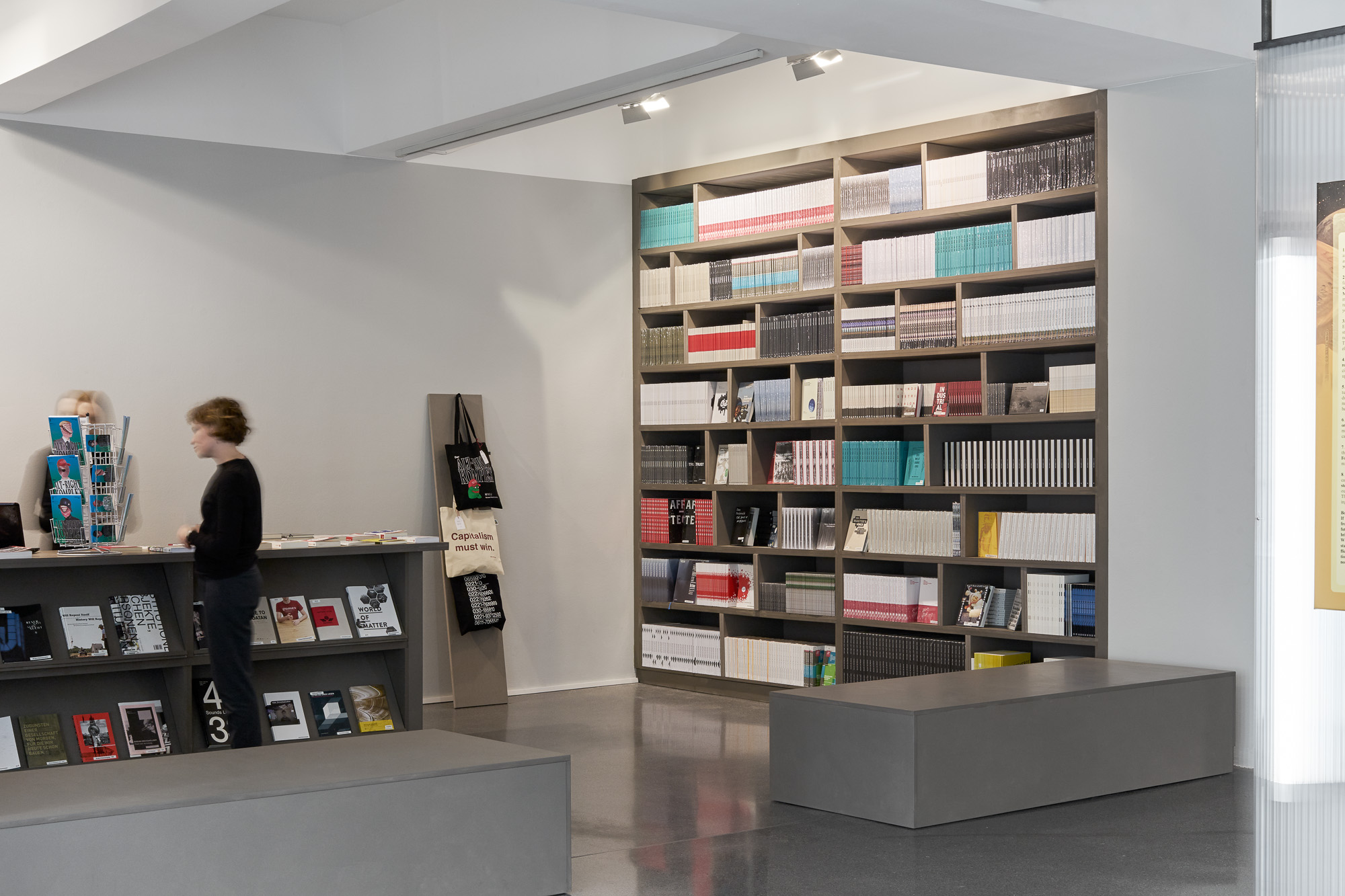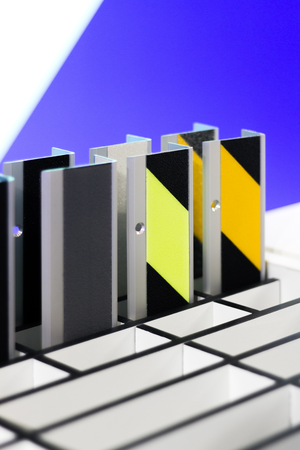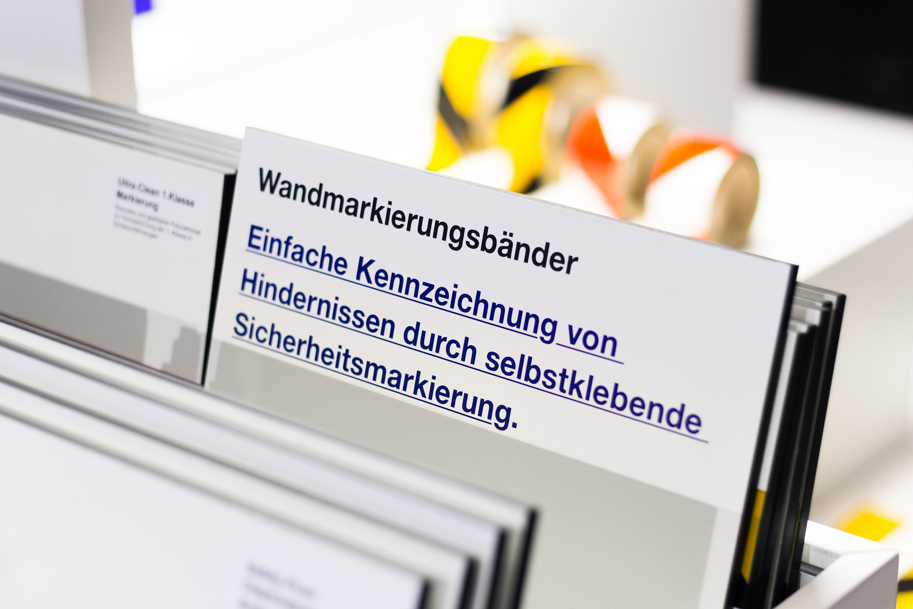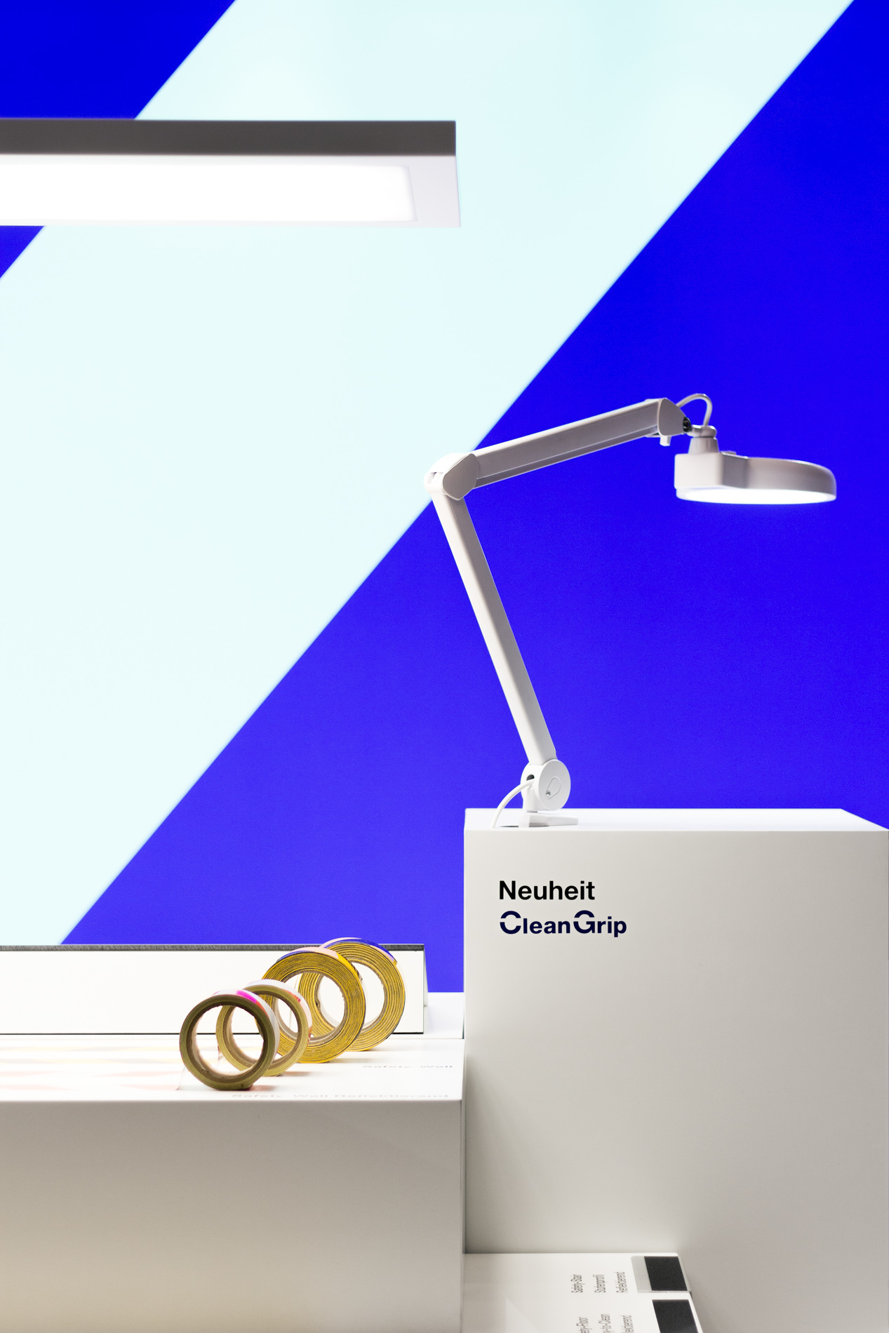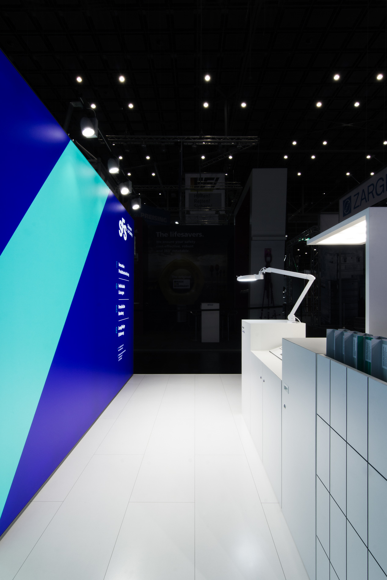 Modularer Messestand für die Präsentation von Antirutsch- und Markierungssystemen auf der A + A in Düsseldorf. Der 28 Quadratmeter große Messestand wurde als Innovationslabor und Produktausstellung konzipiert, die über das quadratische Raster künftig flexibel an andere Grundrisse angepasst werden kann. Besucher:innen können in der Produktbibliothek stöbern, die Rutschfestigkeit der Produkte vor Ort testen und unter einer Lupe untersuchen. In den Zeiträumen zwischen den Messen dienen die Elemente zur Produktpräsentation im eigenen Showroom des Unternehmens. Grafikdesign: Florida