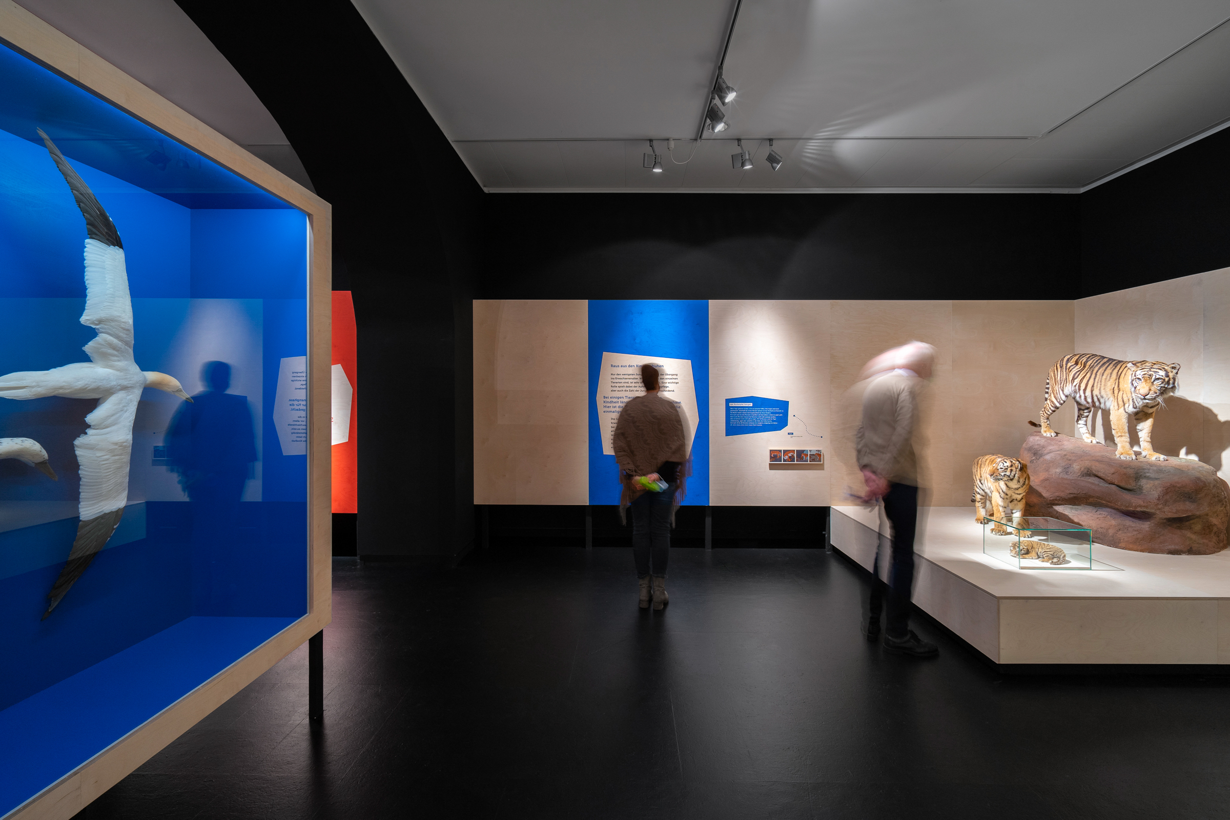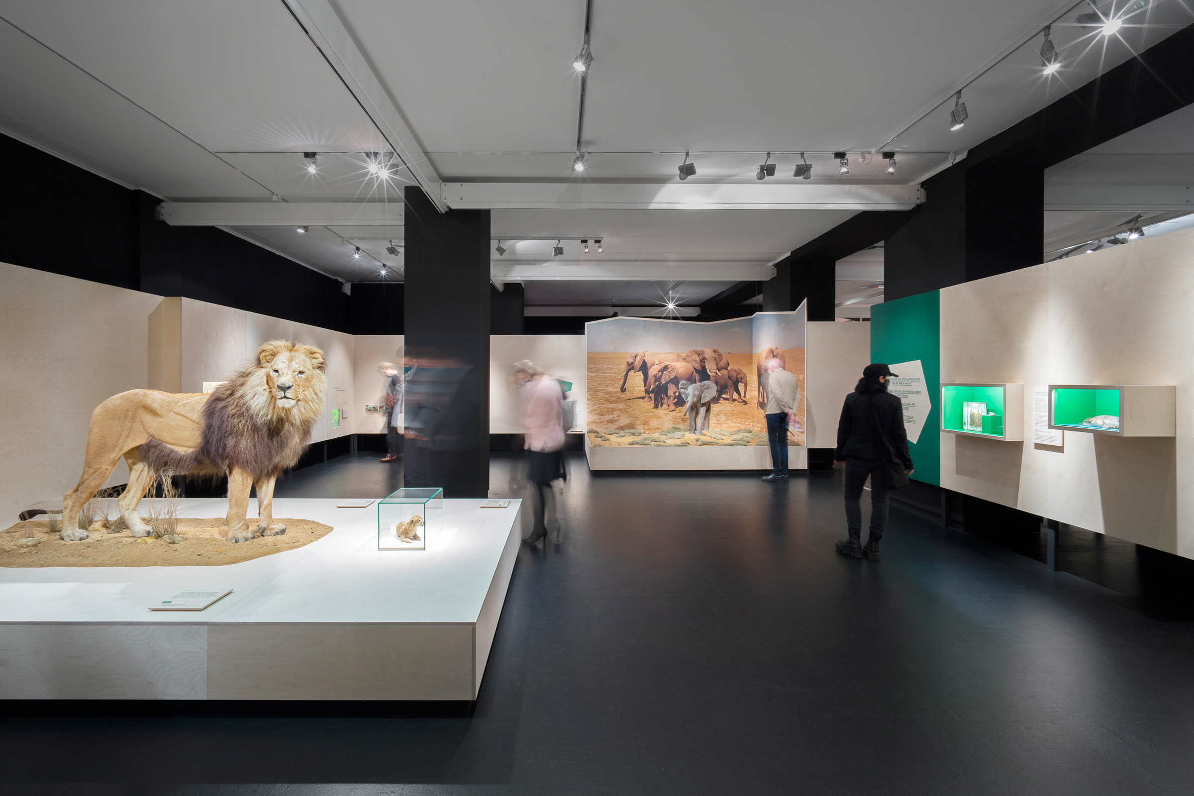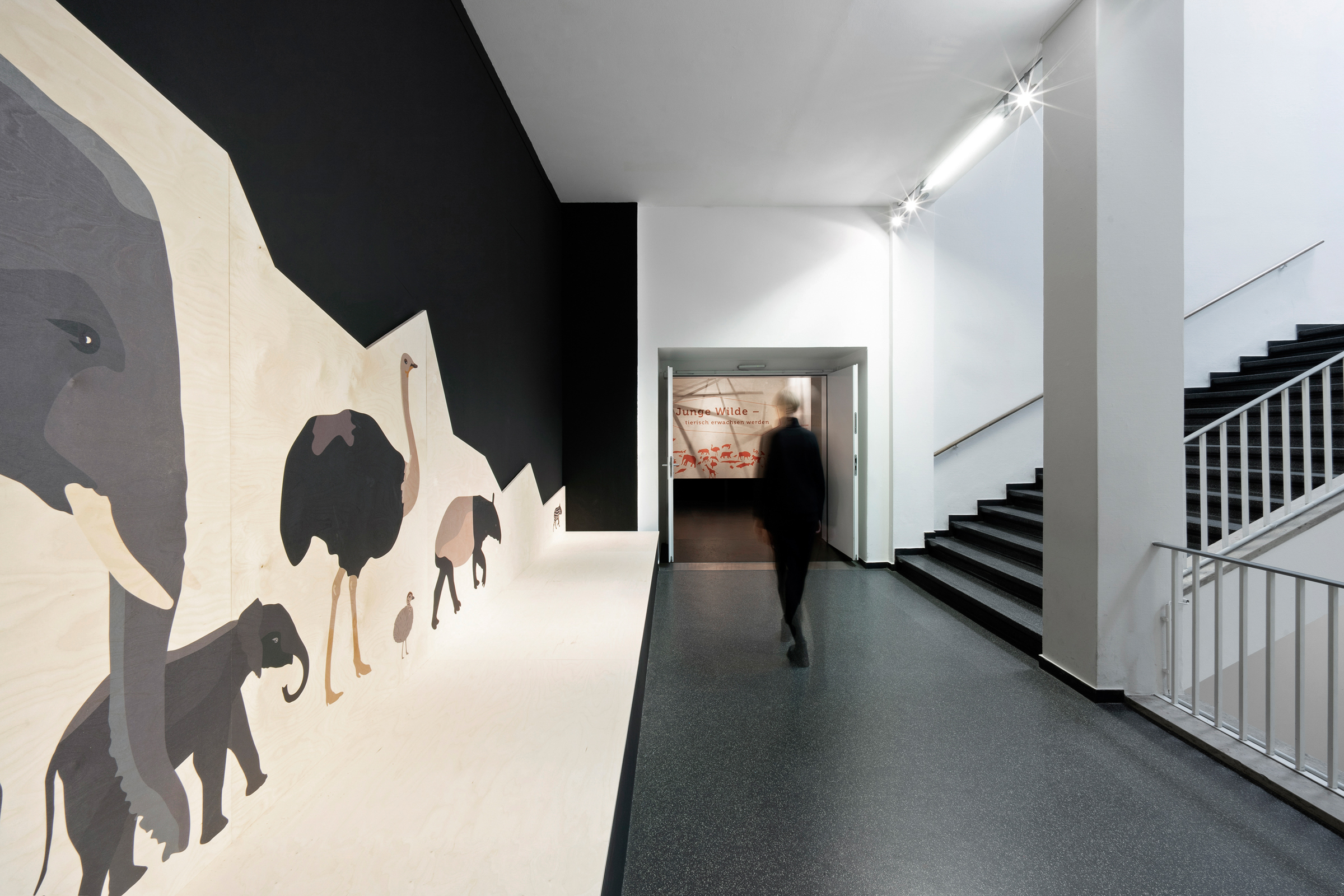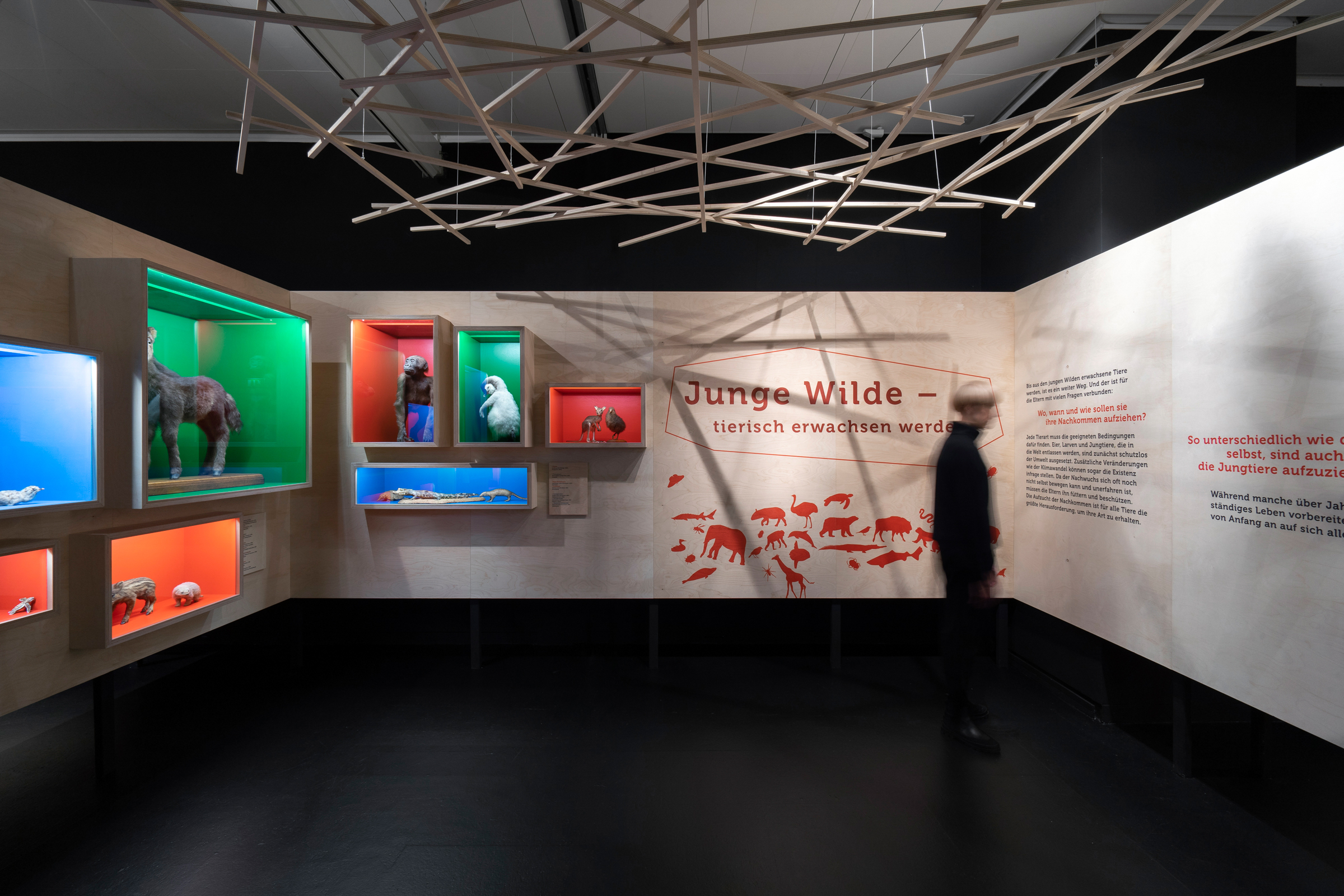 Das Übersee-Museum gibt in seiner neuen Ausstellung "Junge Wilde" einen Einblick in die Kindheit und Jugend von Wildtieren. Die Ausstellungsarchitektur gliedert sich in vier Themen und Kapitel. Zwischen den vier Räumen entstehen offene Korridore, die die Besucher durch vorgesehene Sichtachsen zum nächsten Kapitel führen ohne zu viel preiszugeben. Die Ausstellung zieht die Besucher:innen mit ein und macht die Beobachter:innen zu Teilnehmern:innen.