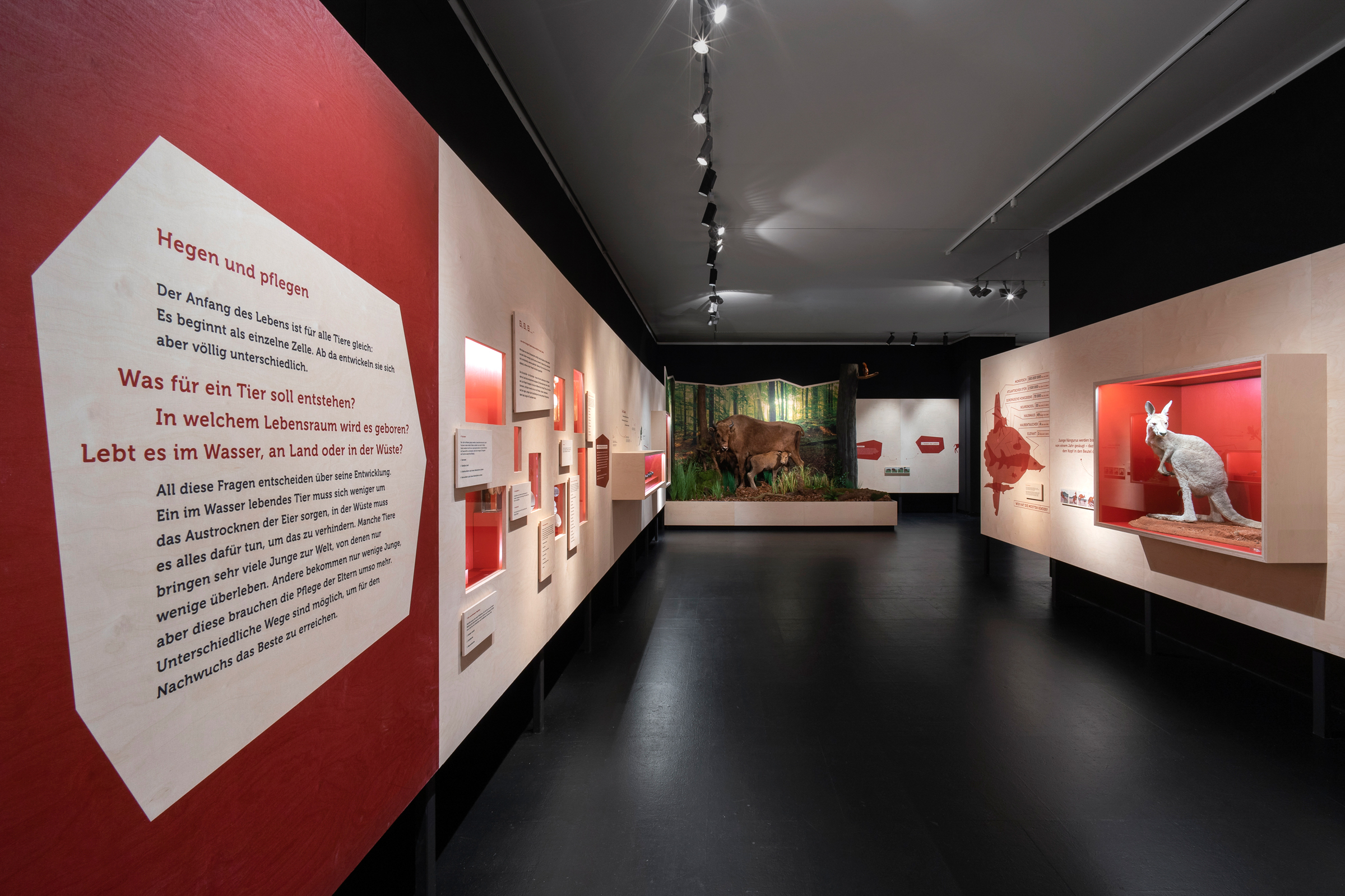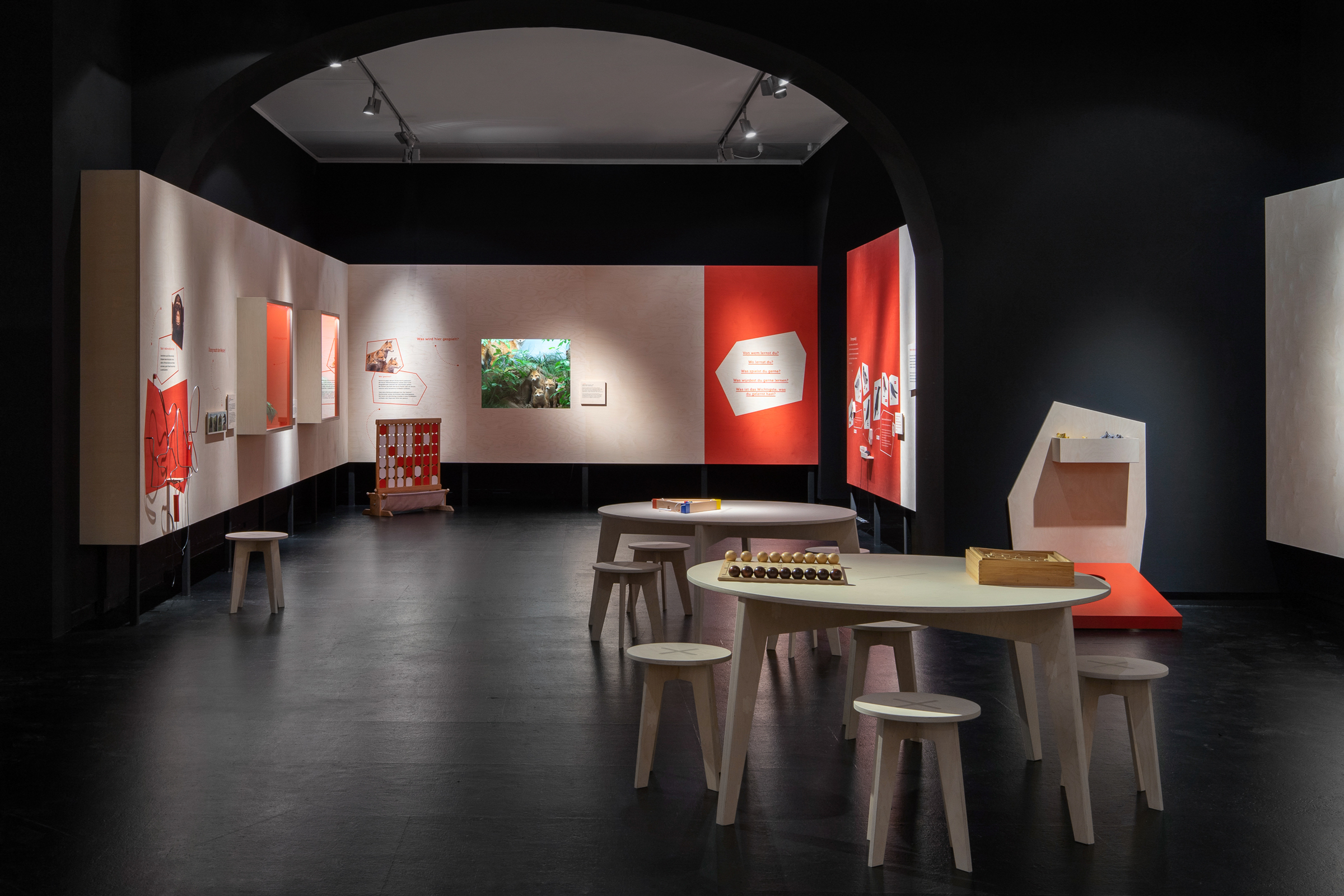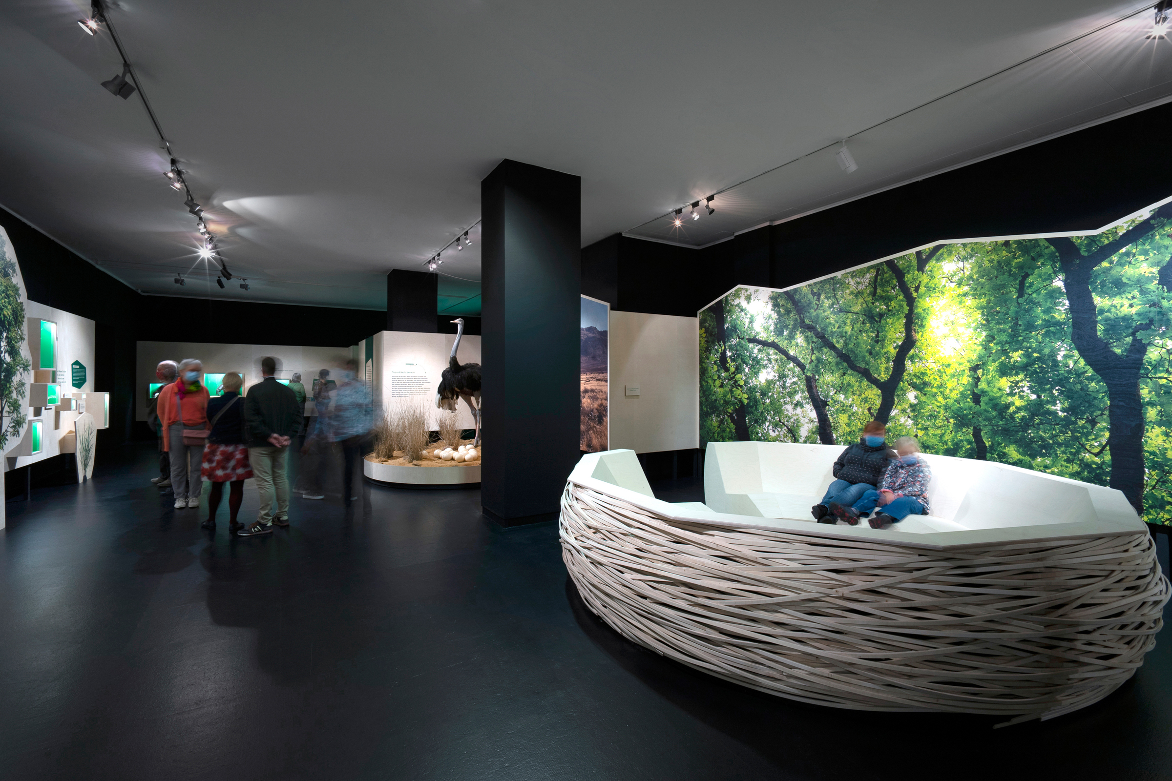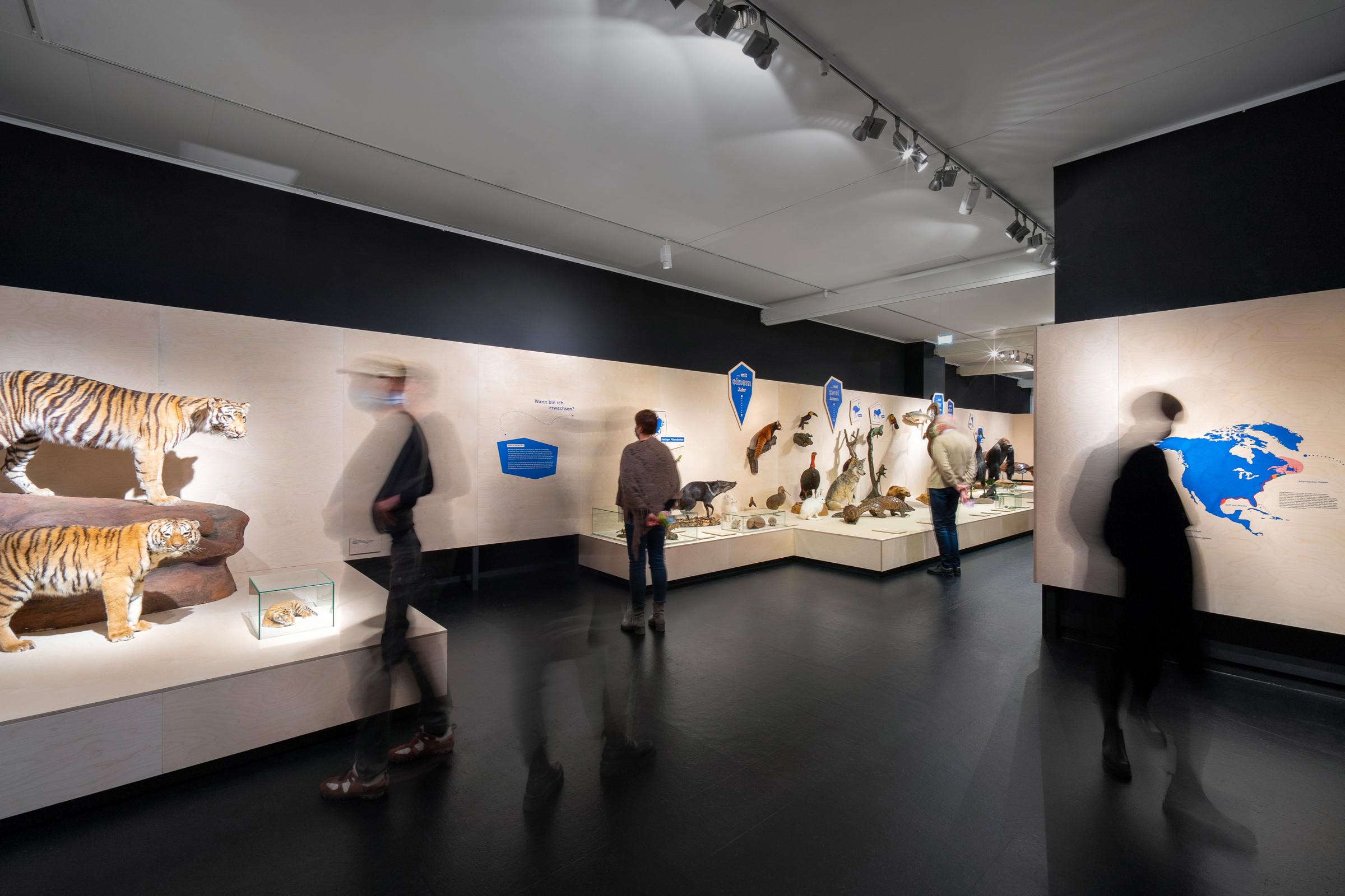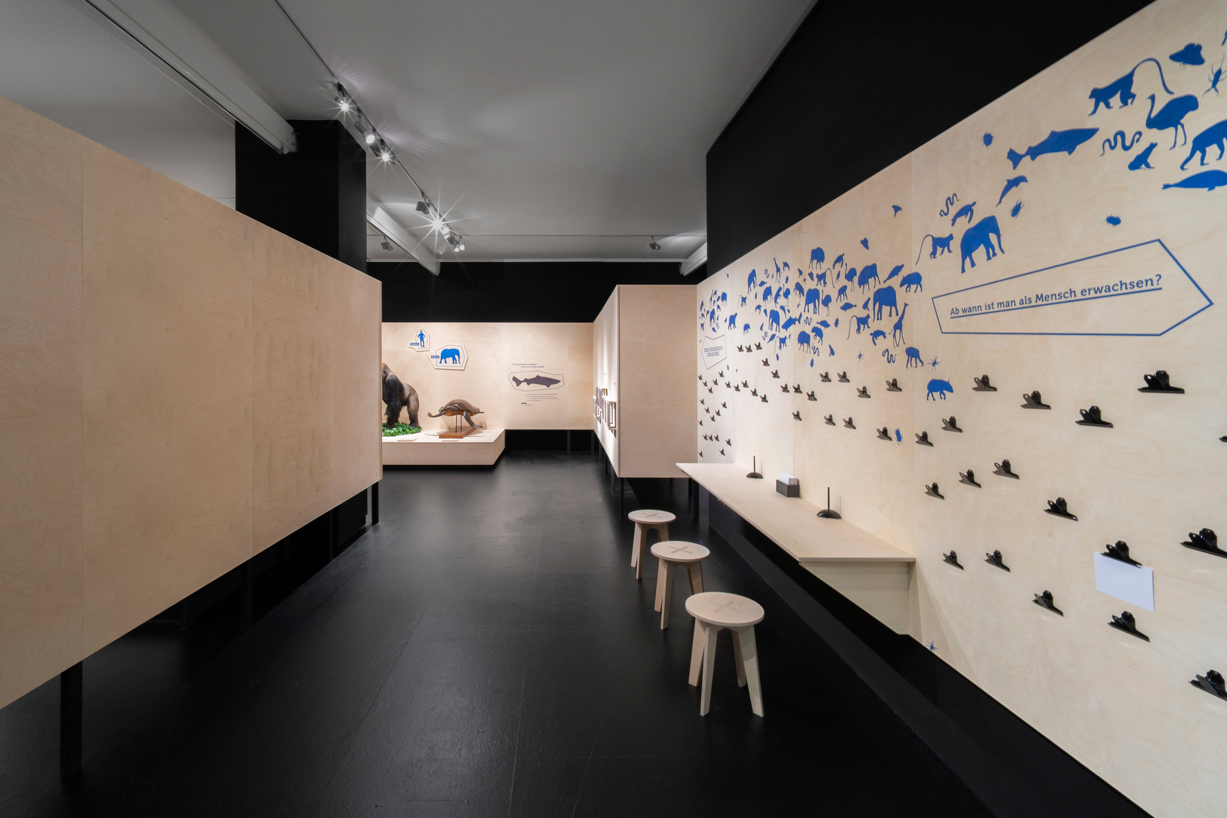 Das Übersee-Museum gibt in seiner neuen Ausstellung "Junge Wilde" einen Einblick in die Kindheit und Jugend von Wildtieren. Die Ausstellungsarchitektur gliedert sich in vier Themen und Kapitel. Zwischen den vier Räumen entstehen offene Korridore, die die Besucher durch vorgesehene Sichtachsen zum nächsten Kapitel führen ohne zu viel preiszugeben. Die Ausstellung zieht die Besucher:innen mit ein und macht die Beobachter:innen zu Teilnehmern:innen.