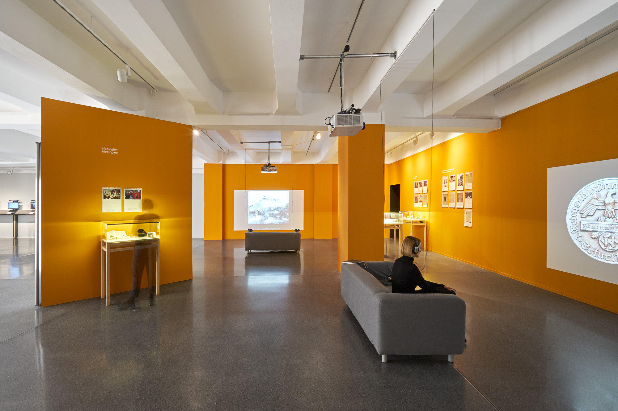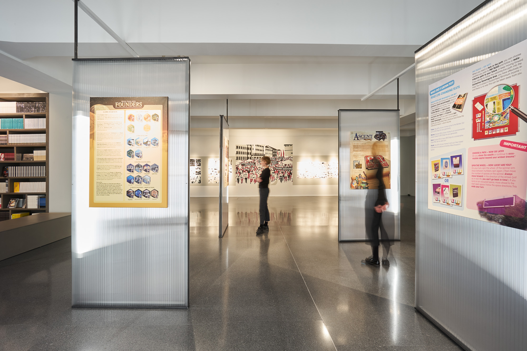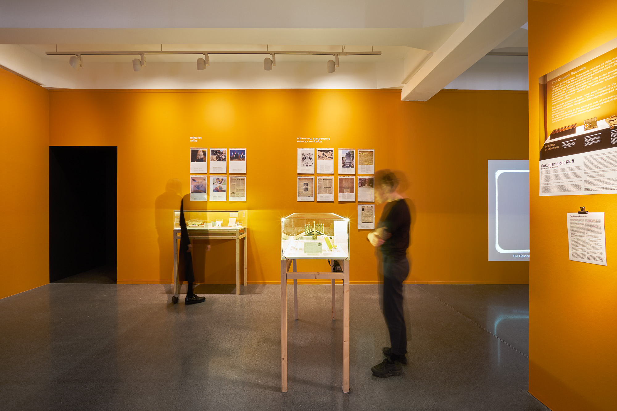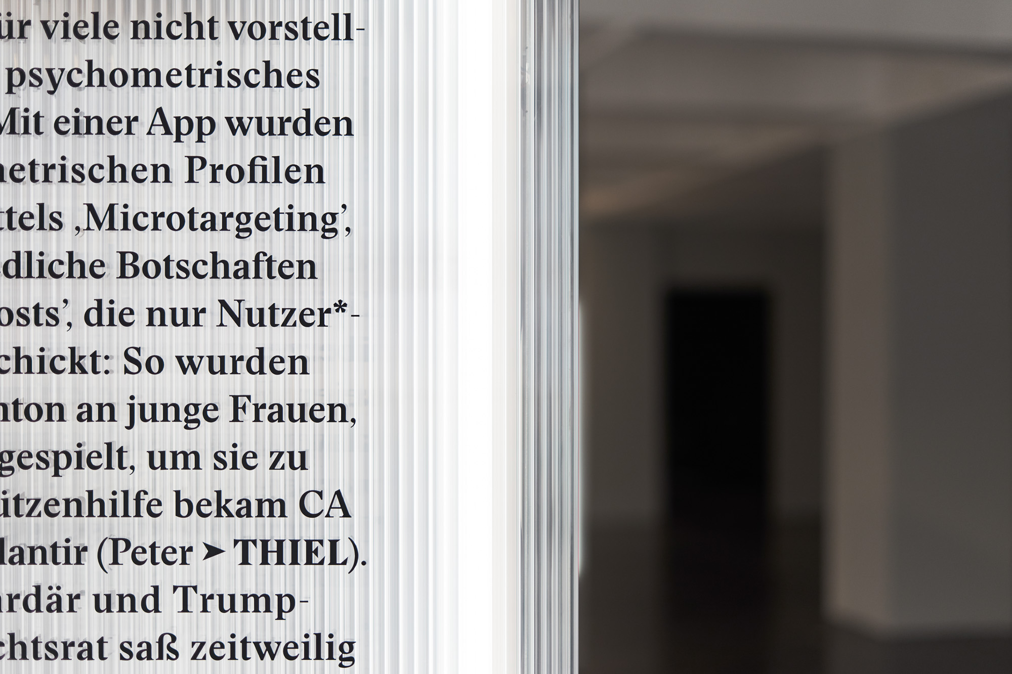 Die Ausstellung „Der Alt-Right Komplex“ vom HMKV im Dortmunder U thematisiert den zunehmenden Rechtspopulismus im Internet. Besonders durch Online Foren und Plattformen können User miteinander kommunizieren und ihr rechtspolulistisches Gedankengut austauschen. Dadurch entsteht eine (Sub-)Kultur, die eine verzerrte Sicht auf die Realität entwickelt hat. Szenografisch wird dieser Aspekt aufgegriffen, indem halbtransparente Doppelstegplatten genutzt werden. Diese erzeugen beim Durchsehen einen unscharfen und verzerrten Effekt. Personen werden nur noch als Silhouetten erkannt, die Typografie ist aus bestimmten Perspektiven verzerrt. Die Besucher:innen werden am Anfang durch eine Reuse in die Ausstellung geleitet. Die zulaufende Architektur, auf der sich ein Glossar mit den wichtigsten Namen und Begriffen aus der rechtspolulistischen Szene befindet, stimmt auf das Thema ein und zieht die Besucher:innen in die Ausstellung. Die Verengung des Glossars erweckt zusätzlich den Anschein, dass es schwierig ist wieder aus der Welt des Rechtspopulismus herauszufinden, wenn man erst einmal hineingezogen wurde.