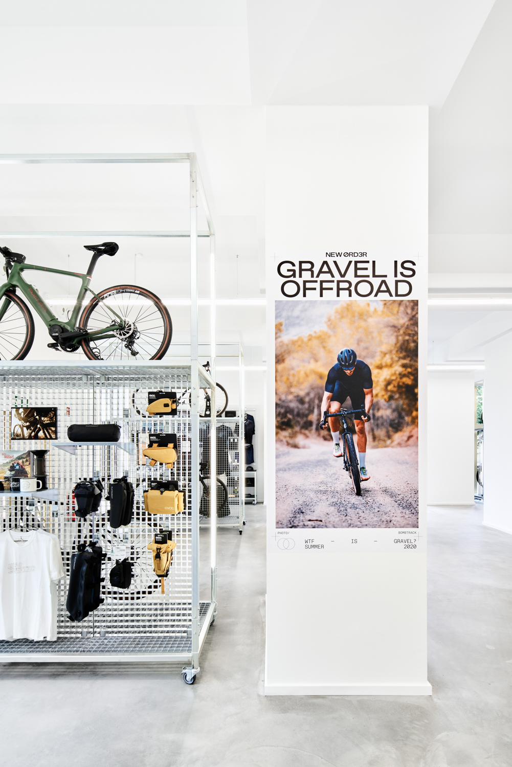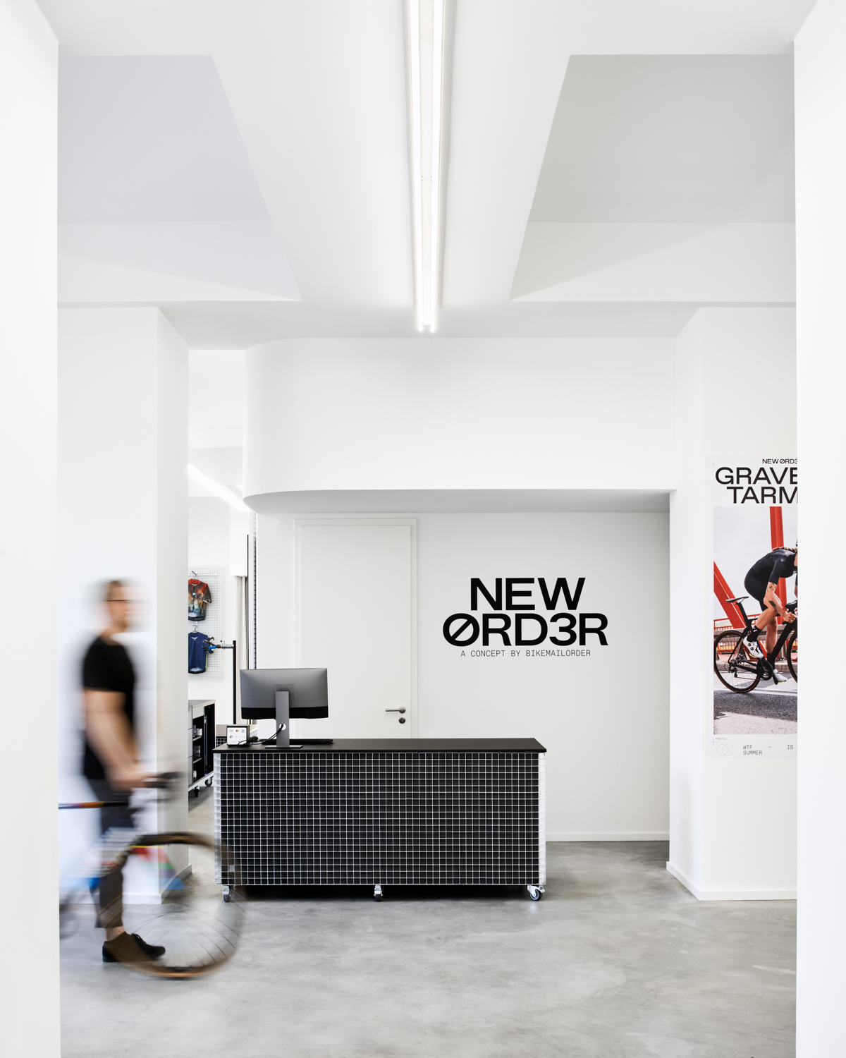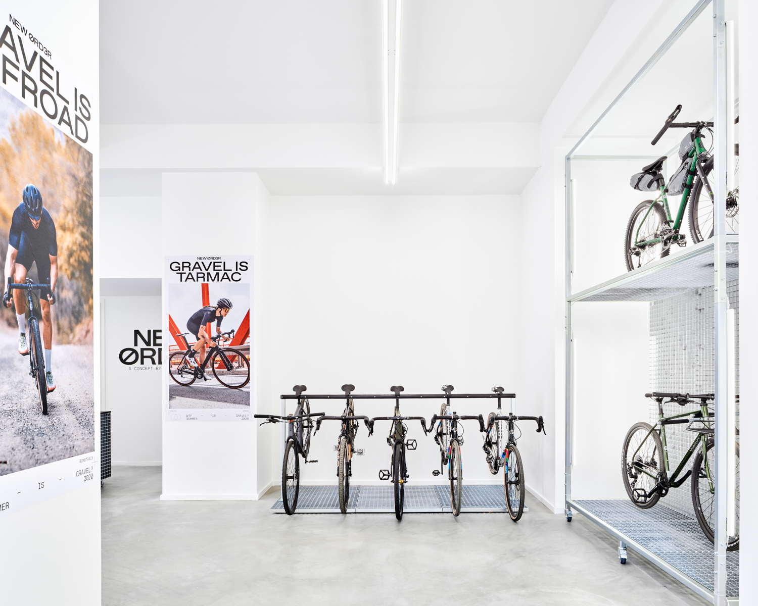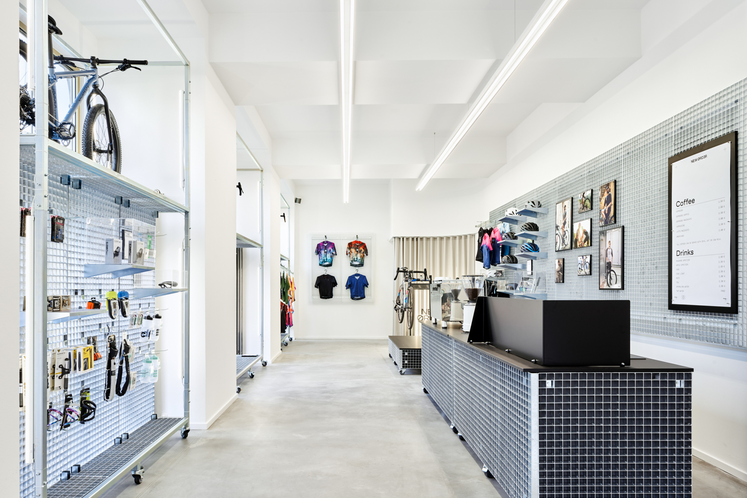 NEW ØRD3R ist ein Fahrradladen auf der Karl-Marx-Allee in Berlin, welcher alle drei Monate seine gesamte Kollektion wechselt. Alle Displays und Möbel sind flexibel und können jederzeit neu angeordnet werden. Mit den verschiedenen Produktträgern können sowohl kleine Produkte, als auch ganze Fahrräder ausgestellt werden. Durch das eigene große Lager in unmittelbarer Nähe, schließt NEW ØRD3R die Lücke zwischen der Produktverfügbarkeit des Online-Handels und der Beratung im stationären Handel. Grafikdesign: Adlips Design Fotos: Annika Feuss