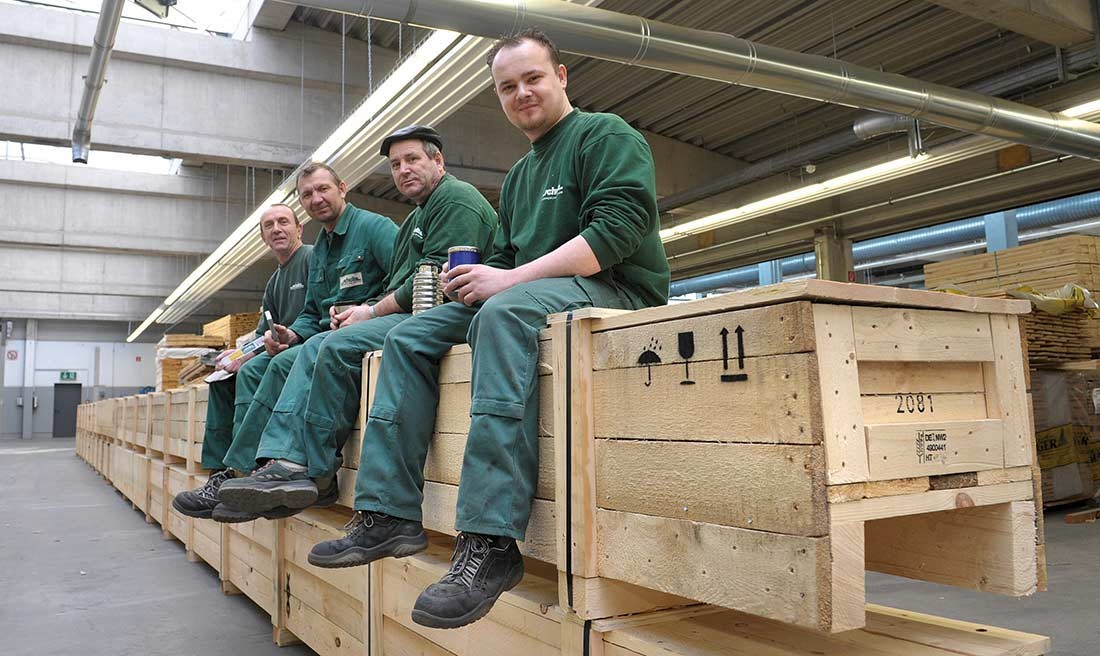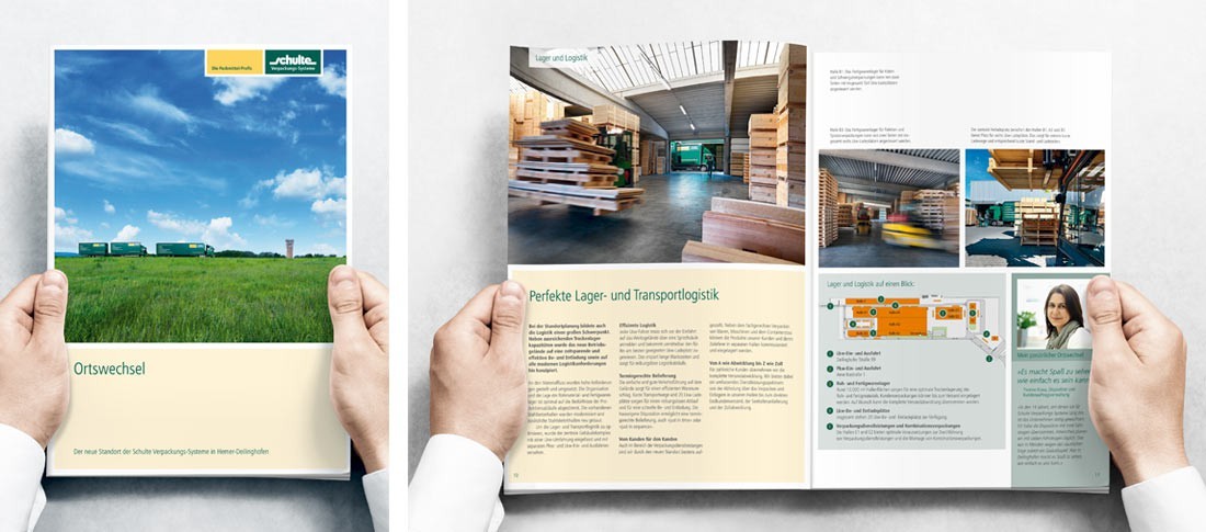 Kisten als Sonderanfertigung bis zu einer Länge von 20 m, Paletten und Schwergutverpackungen sind die Kernprodukte der Schulte Verpackungs-Systeme GmbH. Dazu kommen Dienstleistungen rund um den Bereich Verpacken und Logistik – für unterschiedlichste Zielgruppen wie Rohrwerke, chemische Betriebe oder die Deutsche Bundesbank. Das verlangt nach einer Gestaltung, die genauso robust, flexibel und alltagstauglich ist wie die Produkte von Schulte selbst. Die Betreuung des Corporate Designs läuft bereits seit 1995. Im Laufe der Zeit wurden zahlreiche Maßnahmen realisiert – von Geschäftsdrucksachen und Broschüren über technische Aufbauanleitungen, Hallenbeschilderung und das Wegeleitsystem bis hin zur Arbeitskleidung.