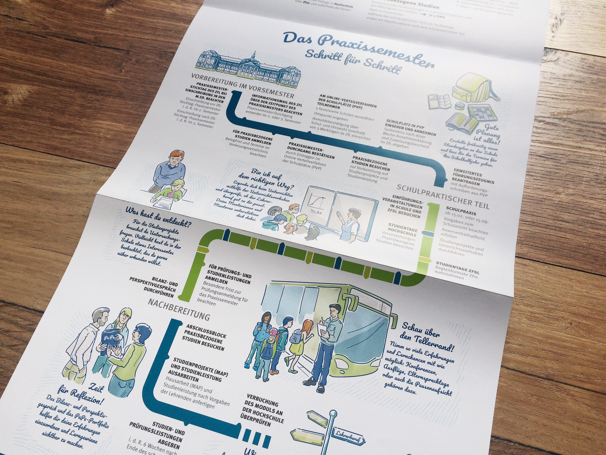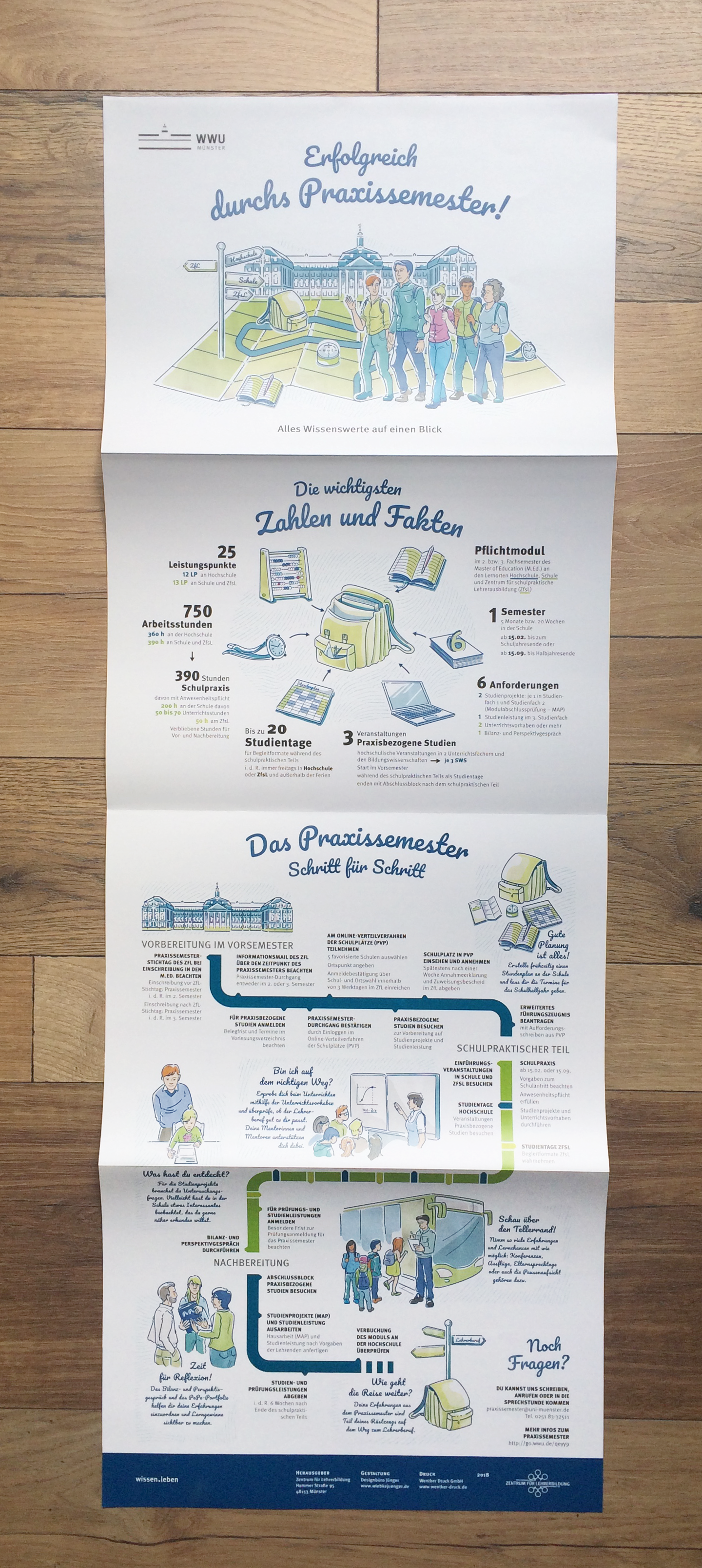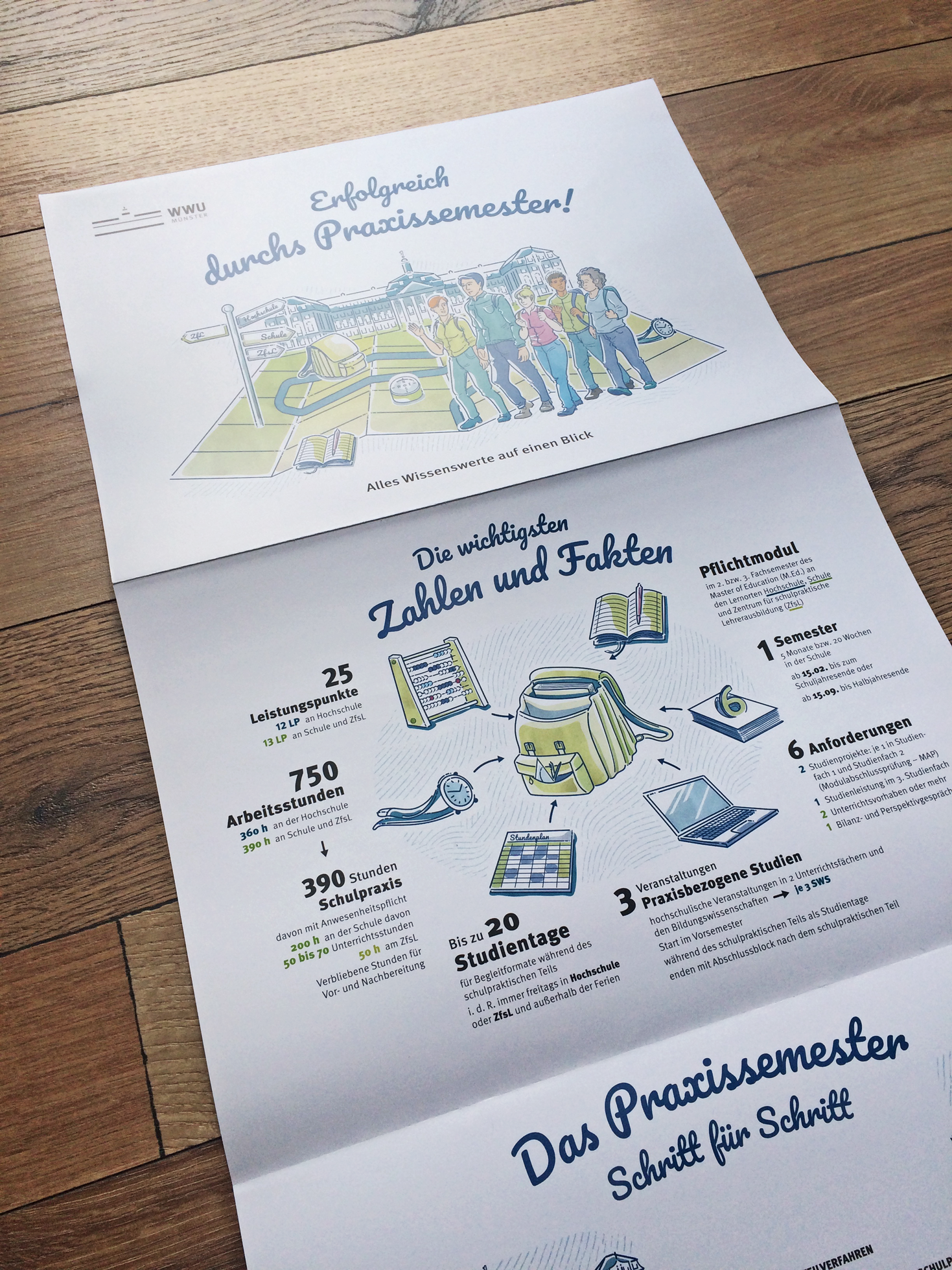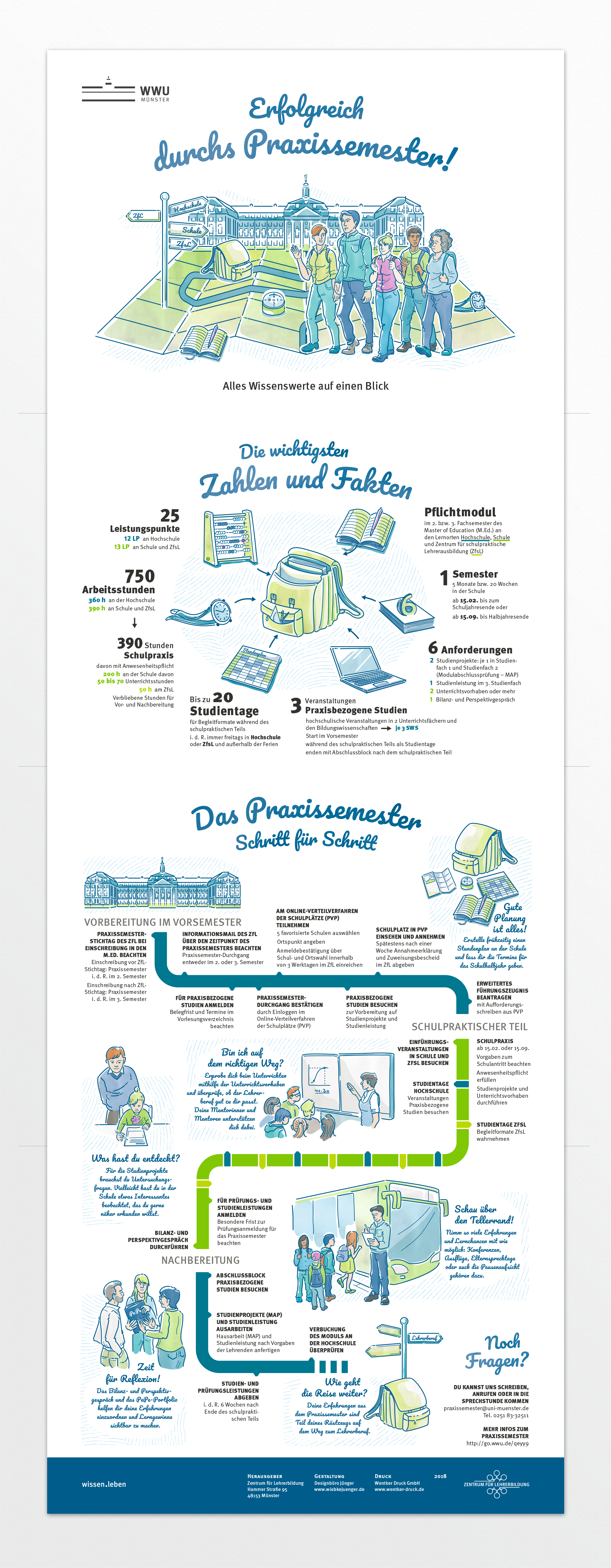 Ein Wegweiser für Lehramtstudierende in Nordrhein-Westfalen Das Lehramtsstudium an deutschen Universitäten beinhaltet den Pflichtblock des „Praxissemesters“, bei dem die Studierenden erste Lehrerfahrungen in der Schule machen sollen. Die Besonderheiten dieses Semesterblocks wurden zu einer Infografik zusammengefasst, die sowohl in den beratenden Instituten aushängt, als auch als Falzposter in einer Informationsmappe für alle Studierenden publiziert wurde. Neben den praktischen To-Do's und zu erbringenden Leistungen der Studierenden wurde eine zweite Storyline entwickelt, die auf die emotionale Reise des Studierenden und auf Fragestellungen während dieses Semsters eingeht und den Studierenden hilfreiche Anregungen für die eigene Entwicklung geben sollen. Für die Darstellung und Illustration der Inhalte wurde ein realistischer, detaillierter und freundlicher Illustrationsstil entwickelt, der sowohl das Thema „Reise“ als auch das Thema „Schule“ miteinander verbindet. Die Farbgestaltung hält sich an das Corporate Design der Hochschule.