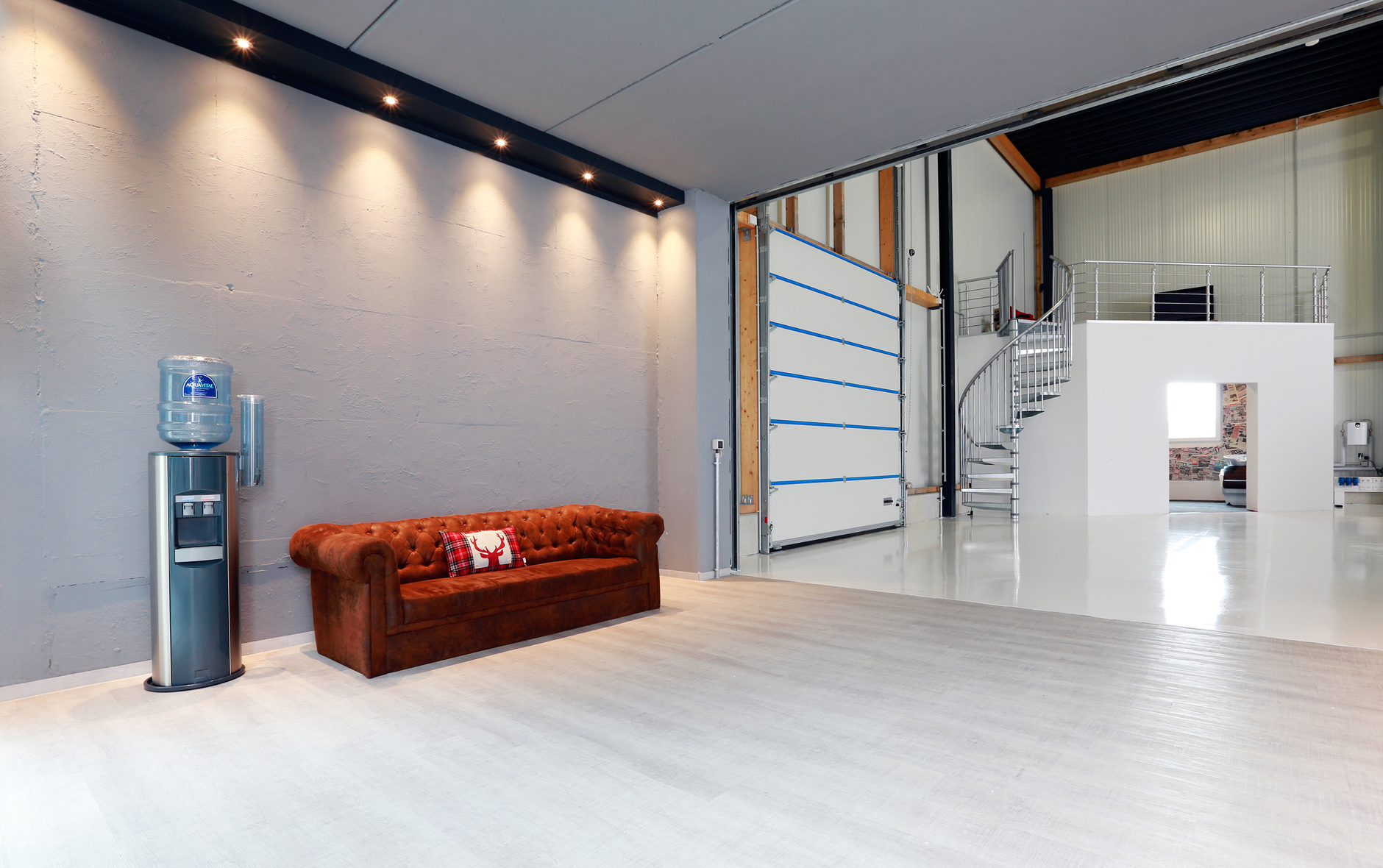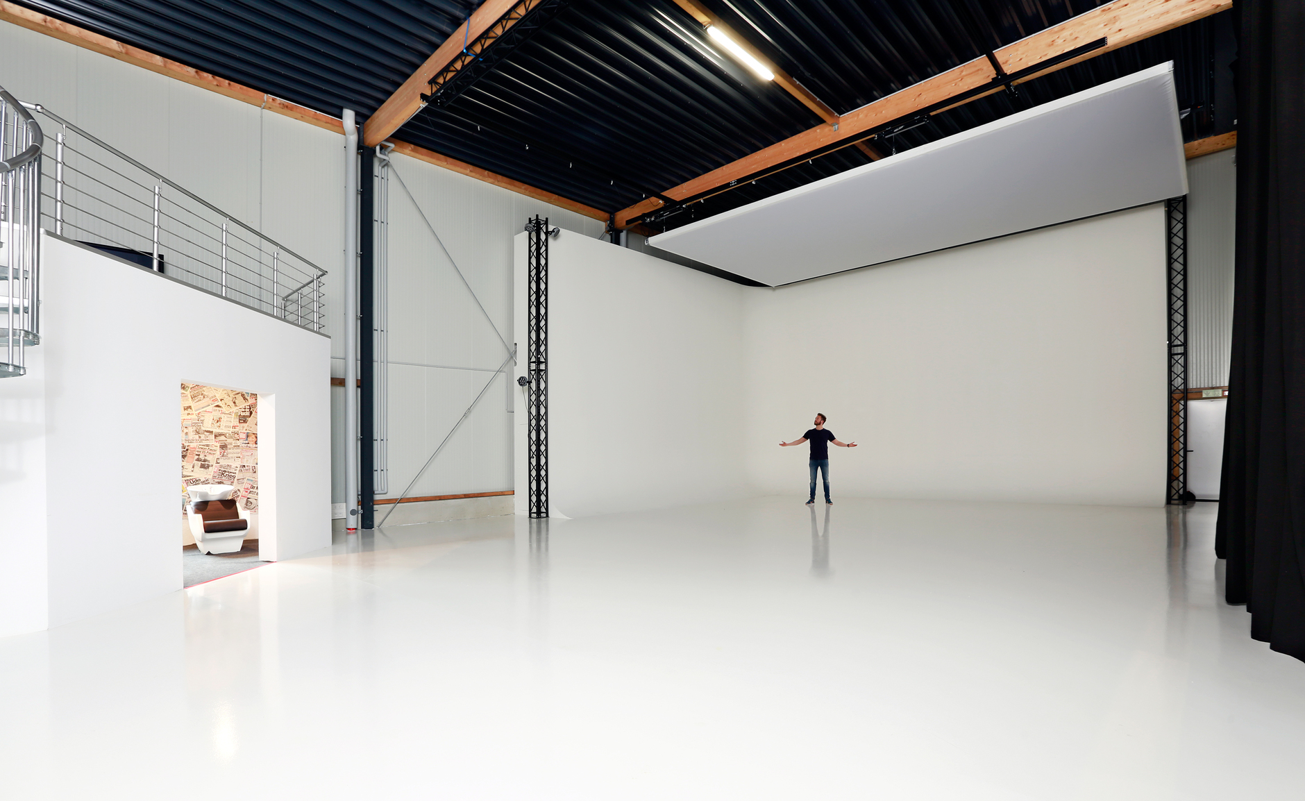 Die Eröffnungsparty ist gefeiert und unser Studio startklar für zahlreiche coole Projekte. Da liegt es natürlich nahe, dass wir unsere heiligen Hallen für Euch einmal in Szene setzen. Also, genießt diesen kleinen Rundgang und kommt mit auf eine Reise durch das Studio Duisburg!Unser Herzstück – das eigentliche Studio – seht Ihr auf dem Bild ganz oben. Um die Größenverhältnisse deutlich zu machen, hat sich unser Fotograf Lars ins Foto geschlichen. Das Studio ist insgesamt acht Meter hoch.Hier der weitläufige Eingangsbereich des Gebäudes: Auf dem nächsten Foto seht Ihr den Übergang vom Eingang in Richtung Studio. Rechts im Bild eines der Highlights: Während sich unten der Visagistenraum mit Haarwaschbecken befindet, haben wir oben drüber eine kleine, aber feine Lounge eingerichtet. Von dort hat der Kunde alles im Blick und kann sich bei einem leckeren Kaffee in Ruhe das Shooting anschauen. Außerdem seht Ihr hier unser Rolltor, wodurch Fahrzeuge direkt in das Studio gelangen können.
